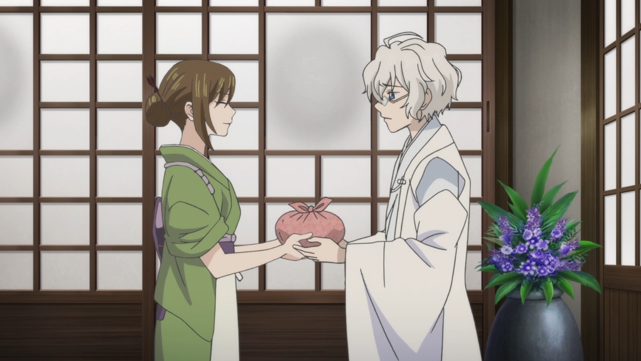 — Oh, they’re just rolls. Aoi hands Byakuya a few so that he can feed them to the the cat ayakashi. I guess inhabitants of the hidden realm can eat anything. After all, I wouldn’t dare feed bread to my cat. In any case, the guy is oddly depressed about the whole situation.