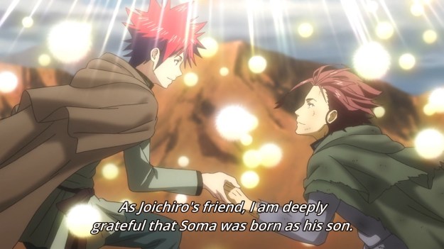 Every Soma episode is ridiculous, but this one even more so. It’s just one big tribute to how much Joichiro owns. He singlehandedly defeated 50 competitors in a shokugeki! His dishes are so revolutionary that they’ll be remembered for decades (c’mon, it’s just food). But the pressure, man! The pressure got to him! Cooking was no longer fun! He broke down and had to leave the school altogether! Ahhhhh!!! But you know who saved him? You know who? His son! But I’m just like, “Yo, what about the woman he knocked up?” Surely, he must have fallen in love with Yukihira’s mother, right? But it’s all just about the kid, huh? He’s so awesome, he saved his dad by just being born, huh? It’s funny, ’cause the show also makes no mention of Erina’s mother. Where are the two leads’ mothers?! And I couldn’t help but laugh at Joichiro taking pride in Yukihira’s ability to lose 490 times in a row to his old man. I get what the show is trying to say. For our hero, cooking is always fun even when he’s losing. That’s what makes him special. But I still laughed because in my mind it’s like, “I whip this kid’s ass 490 straight times, and he’s still smiling — what a sucker!” Whatever, I hope they got their Joichiro lovefest out of their system and we can get back to moving the story forward.