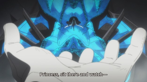 — The Princess soon catches up to Strelizia, and Zero-Two is unable to move. When Hiro sees the Princess, he’s reminded of how his girl used to look. I’m still holding out for an a grown-up version of that Zero-Two. I hope she kicks ass in the finale looking like that. But first things first, the Princess is here to mess things up.