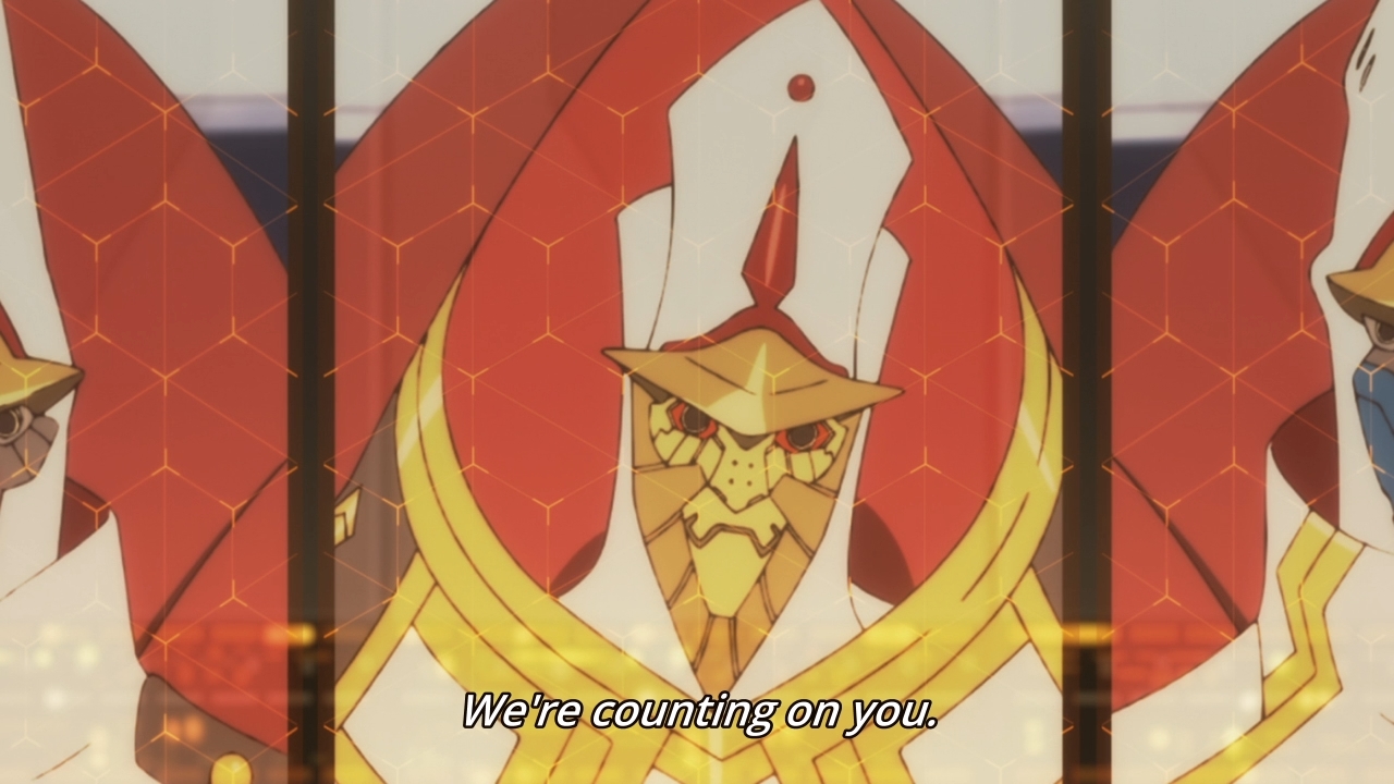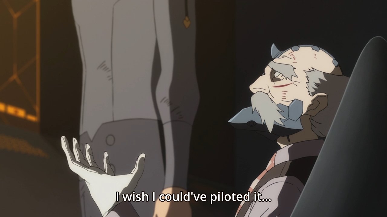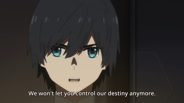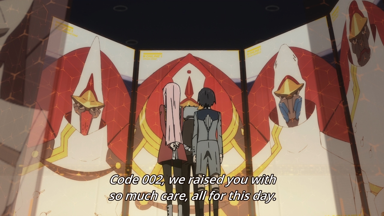 — I still really want the kids to rebel now. Nothing good will come of this mission. Why would you ever believe anything that Papa and the Sages tell you anymore? They’ve done nothing but hurt you in recent history. But I guess this is what it means to be a child, isn’t it? You don’t want to disappoint your parents. You want them to be proud of you, especially when they’re counting on you. You just want to please them so that they love you even though they never will. Zero-Two mutters under her breath, but she’ll still go along with the plan. Maybe she’s being swept along with Hiro’s feelings.