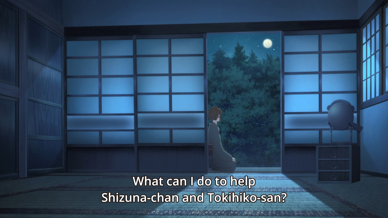 — What makes this relationship unsettling for me is that Tokihiko took Shizuna in when she was a child. This show has an obsession with grown men caring for young girls, then falling in love with said girls when they grow up. It’s just gross, because how do you not see her as a daughter? How do you end up falling in love with someone you used to head-pat like your own child? You have Aoi and her mysterious helper. You have Shizuna and Tokihiko. And in a way, you also had Suzuran and Shiro. Aoi’s grandfather didn’t fall in love with Suzuran, but she sure as hell fell for him.