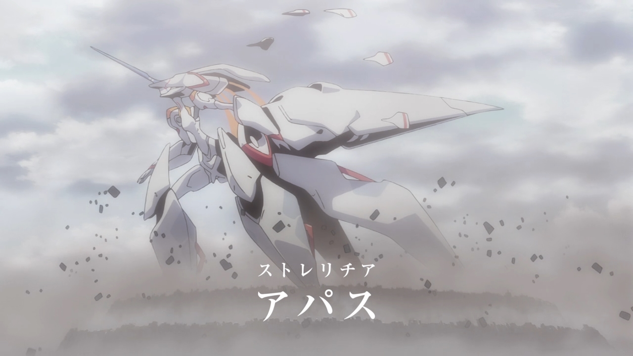 — Strelizia Apath bursts frees from its prison, then proceeds to strike back at VIRM. And just like that, the alien entity grabs the massive spear and bails. Really? That’s it? They’re cutting bait and high-tailing it outta there? Hiro and Zero-Two try to grab hold of the spear, but they can’t prevent it from flying off into space. Nevertheless, with this insert song blaring in the background, this really feels like a series conclusion.