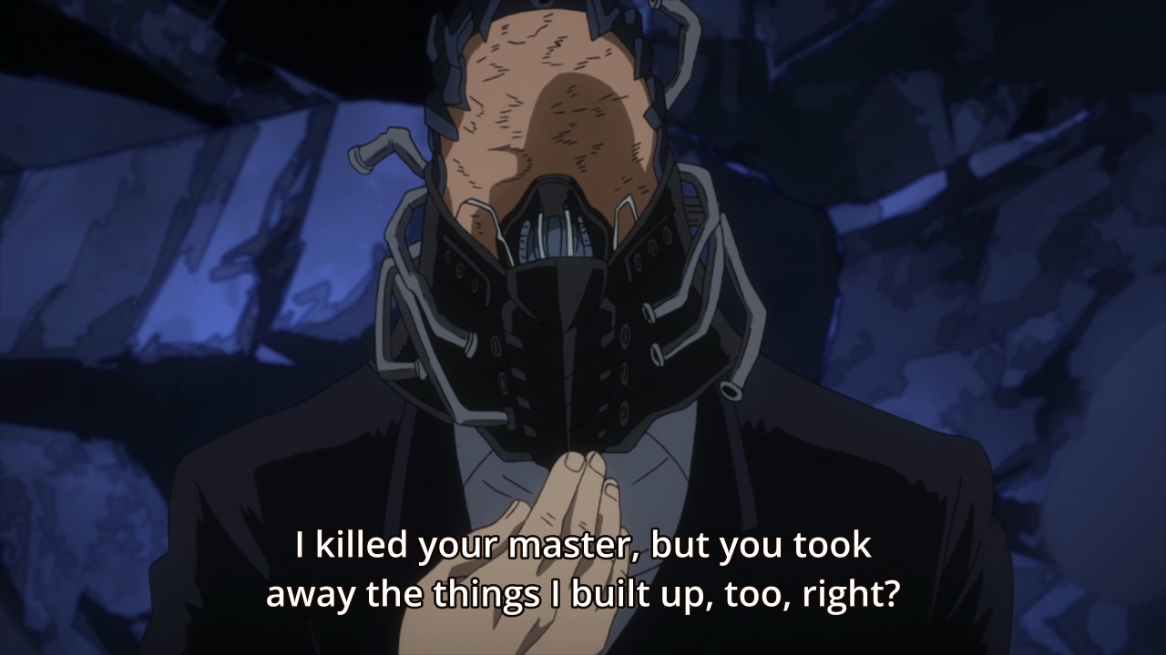 — There’s also too much chatter. All For One just isn’t a cool villain. He sounds like a huge dork to me, and he talks like a huge, petty dork. As a viewer, sometimes you want to indulge on the dark side, but I can’t see myself doing that here. Neither he nor Shigaraki make me ever want to root for the villains. And you’re probably like, “That’s the point! You shouldn’t like villains!” But like I said, this is why I’m not saying that the episode (or the show in general) is poorly executed. Rather, I just don’t think it’s to my taste. I like compelling villains — charismatic enough that I can’t help but understand where they’re coming from. Unfortunately, I don’t give a shit where All For One is coming from. He’s just a dumb asshole with no interesting ideology.