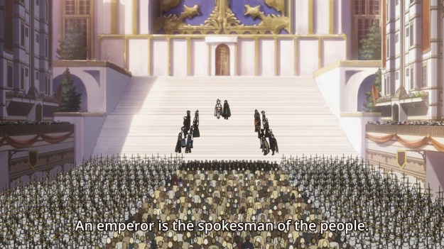 — So Dmitrie doesn’t want the Age of Chaos to end because he would lose all his powers (and thus his immortality). Likewise, a lot of greedy Lords and Mages wouldn’t want to give up their Crests and magic for peace. Theo, however, will fight for the people! Yeah, we need the Age of Cosmos so that the commoners will no longer have to suffer! But if you consider the death toll in this anime, the number of commoners who have had to die for Theo’s cause is probably immeasurable. I just find that amusing.