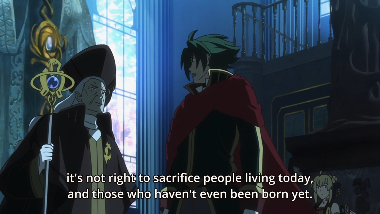 — So Dmitrie doesn’t want the Age of Chaos to end because he would lose all his powers (and thus his immortality). Likewise, a lot of greedy Lords and Mages wouldn’t want to give up their Crests and magic for peace. Theo, however, will fight for the people! Yeah, we need the Age of Cosmos so that the commoners will no longer have to suffer! But if you consider the death toll in this anime, the number of commoners who have had to die for Theo’s cause is probably immeasurable. I just find that amusing.