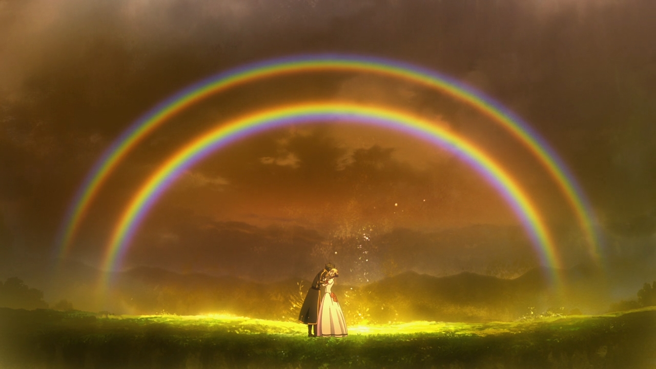 — Hey, look at that rainbow! See? Anime is getting into pride month, too! Just kidding. The episode — and the entire series — ends with a kiss between Theo and Siluca. Welp, at least we have one happy couple in the books. Let’s see who else can survive their finales. Looking at you guys, HiroxZeroTwo, MitsuyoshixTeresa, and JoexYuri. I’m probably forgetting another couple…