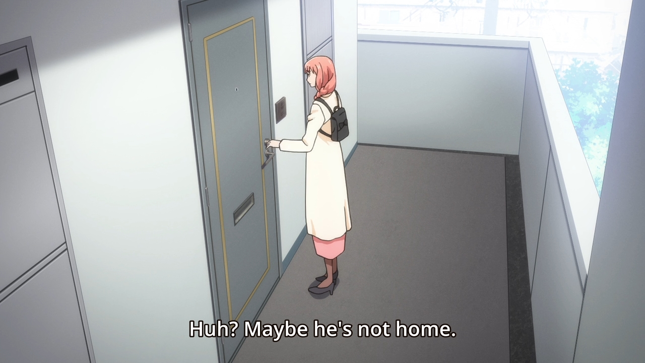 — Speaking of communication, Narumi has decided to pay Hirotaka a visit. It’s an unannounced visit, though. As a result, she worries that he might not want her around. She worries that he might think of her as a bother. You know how you could solve this problem? By communicating with him. Sure, she might want her visit to be a surprise, but that’s still easy to circumvent. Just ask him beforehand if he would ever have a problem with her showing up at his apartment unannounced. That’s not so hard, is it?