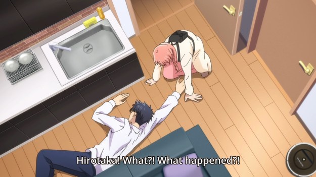 — Anyways, when Narumi gets to Hirotaka’s apartment, nobody answers the door. For some reason, the door is unlocked, and she quickly finds the guy collapsed on the ground. But this is Wotakoi, so the guy isn’t in any serious danger. He simply collapsed because he played games so much that he forgot to eat. Haha, what an otaku!