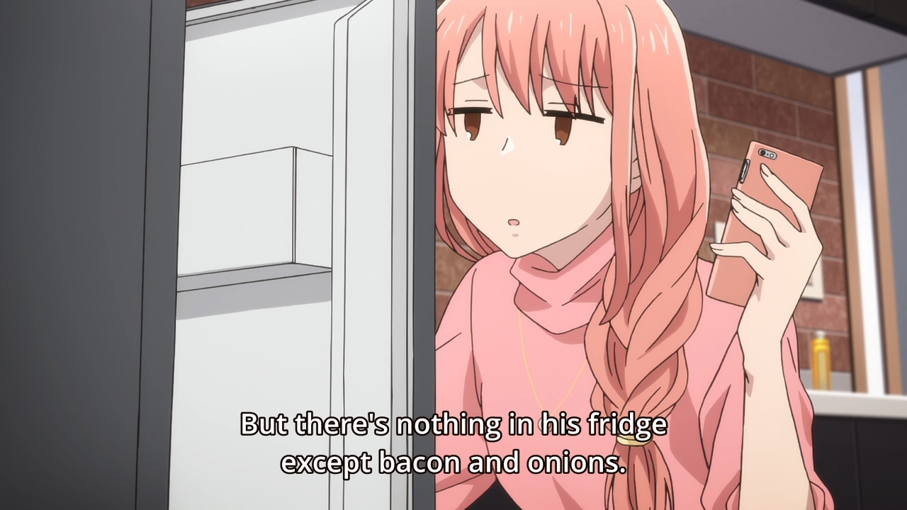 — This sounds like my kind of fridge. Who needs more than bacon and onions? Just kidding. If he had eggs, she could at least make an omelette. Or a scramble if she sucks at omelettes.