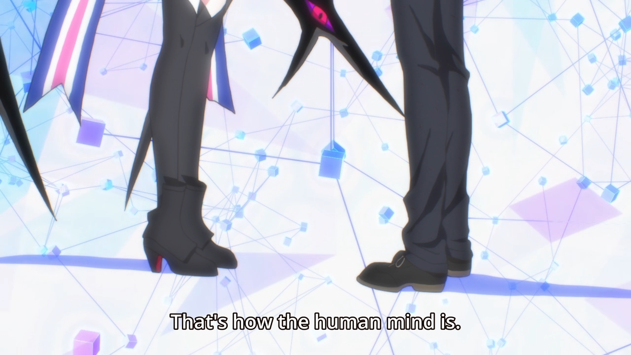 — To make a long story short, he’s in love with a program that he helped write. And with that, Ritsu saves Mu and everyone trapped in Mobius. He still has to shoot her with his fake, virtual gun, though. Ho hum.