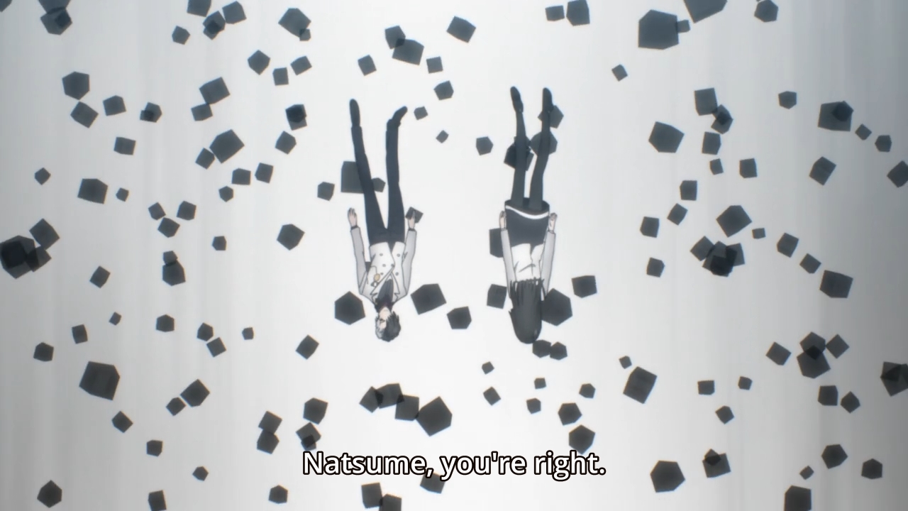 — Finally, Shogo tackles Thorn to the ground, and they both proceed to fall into the great white void beneath them. It’s a good thing gravity still works. And see? Now they get to commit suicide together and meet Ichika in the afterlife!