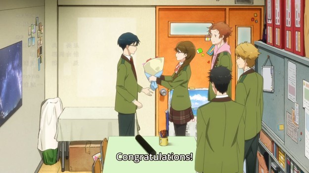 Second — and this ties into the first problem — the anime wastes far too much time on unnecessary characters. The only person who accompanies Mitsuyoshi to Larsenberg is Kaoru. None of the other characters matter at all. So why devote an entire episode to Pin-senpai and Hinako? Why devote an entire episode to Dog-kun and Imouto? Why devote an episode to the fucking cat? They don’t actually help our main couple get together at all (well, the cat kinda helped). Sure, these characters don’t have to do that. After all, they have their own stories and their own lives… but do they? Because none of the characters I just mentioned have any sort of resolution to their stories whatsoever. We see Pin-senpai graduating at the end of the episode, but that’s it. Is he going to get together with Hinako at some point? Who knows! And who cares, apparently, because the story sure doesn’t. It’s a loose end that goes nowhere, and that’s exactly what I’m getting at. The time we took to establish Pin-senpai as a character could’ve been spent on Mitsuyoshi and Teresa.