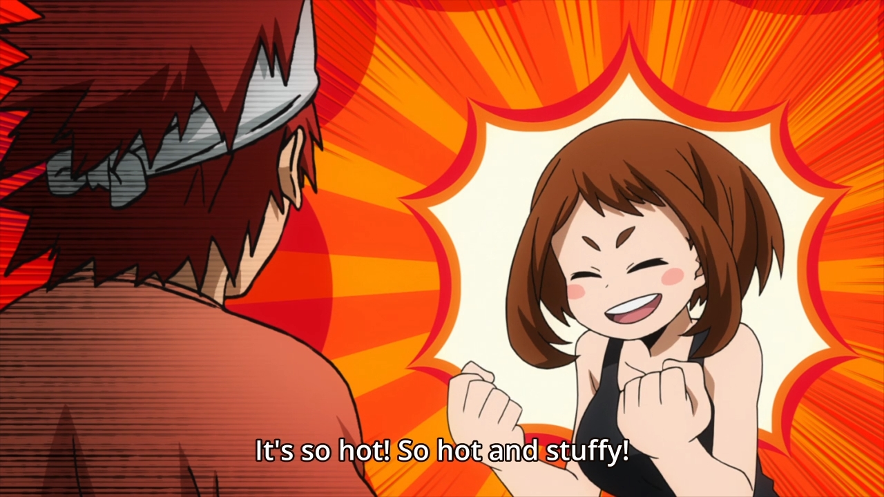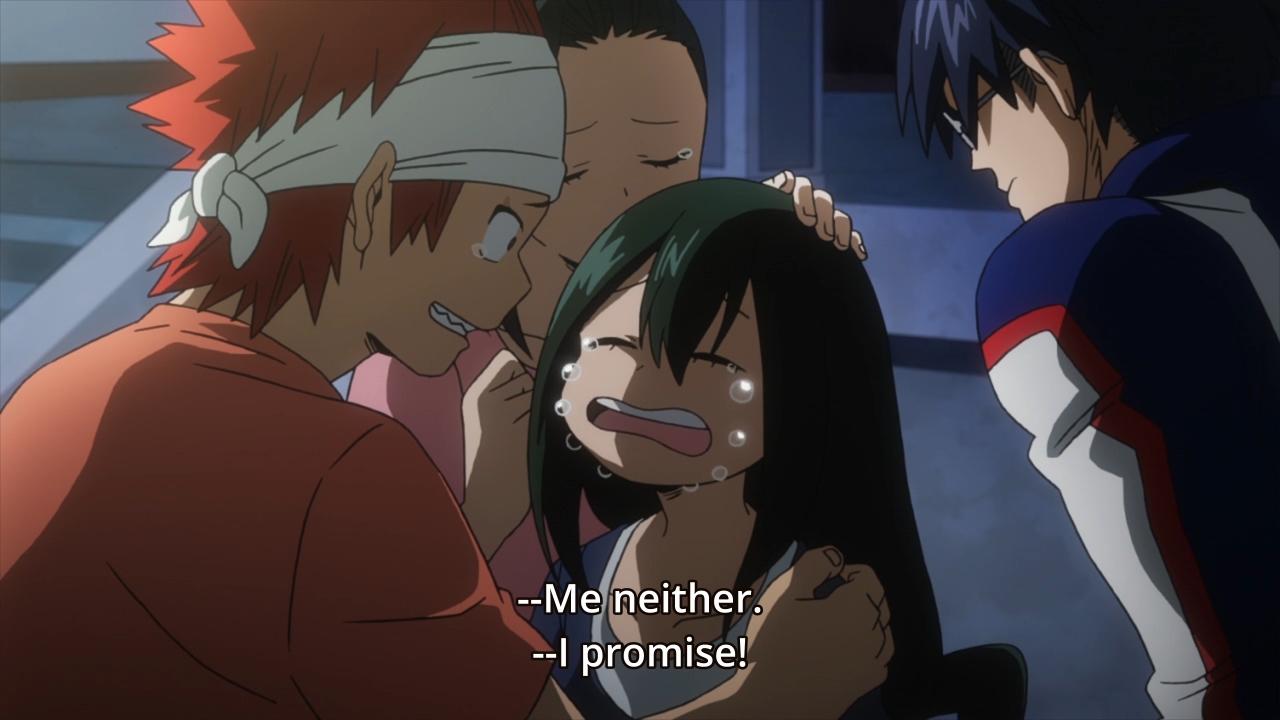 — As for me, I find this whole moment both super melodramatic and corny. I don’t really think Asui had said anything all that bad. Clearly, nobody even remembered what she had said. And honestly, I just don’t think it’s worth getting worked up about. Then again, everyone’s programmed differently.