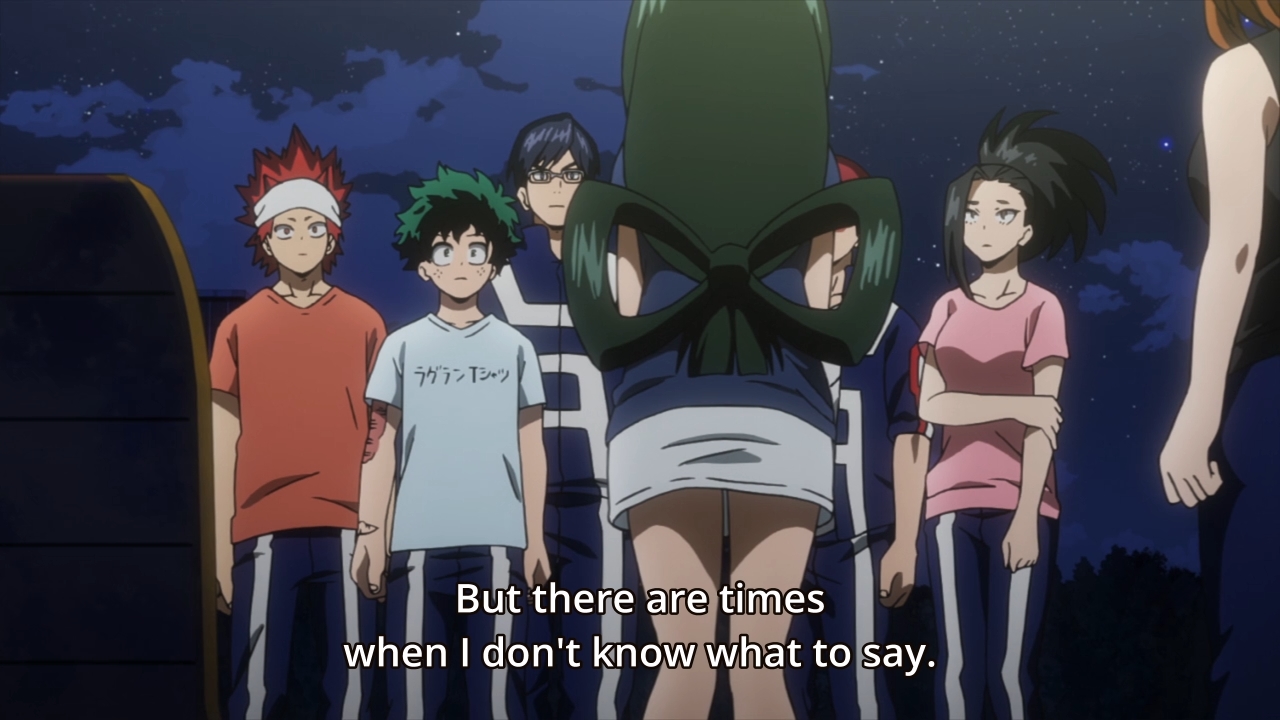 — Then once all of the fun and excitement have subsided, Asui wants to speak to the troublesome five by herself. Y’see, back in the previous arc, she said that they would be acting like villains if they broke the rules. At the time, I brushed the comment off, because it just felt like a throwaway analogy. It turns out, however, that frog girl feels super guilty for having said something apparently so mean. At the same time, however, she was disappointed that she didn’t actually manage to stop them from pulling their crazy stunt. As a result, she didn’t feel comfortable pretending as though everything was okay again tonight. She didn’t feel comfortable hanging out with everyone. Not without apologizing first anyways. So y’know, Uraraka does her genki girl thing, then everyone else proceeds to comfort Asui. They promise her that they won’t do anything so reckless again (but I highly doubt that).