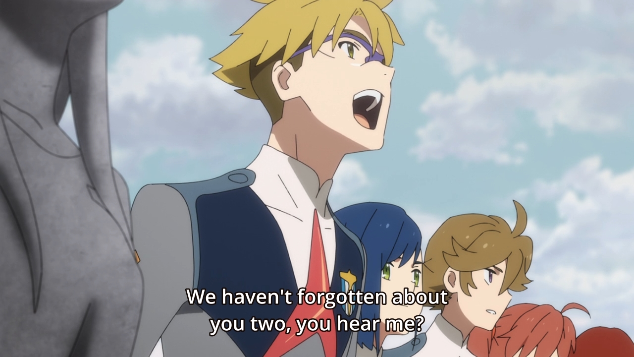 I’ll cover the rest of the episode through my notes below. For now, I just want to wrap my overall thoughts and feelings about the series. I think what we have on our hands is a tale of two halves. The first fifteen episodes? I really, really liked them. I know a lot of you didn’t, but I absolutely adored the character drama, the social commentary, and the overall mystery of the setting in the first half of the series. If I could grade those first fifteen episodes on their own, I’d probably give the series a B+. And then the second half of the series happened. I still like Hiro and Zero Two as a couple, but somewhere along the line, the guy became useless. He stopped actually doing anything. He’s just there. He literally just has to be present in order to make Zero Two strong and powerful. But in terms of actually playing a major active role in the narrative, Hiro all but disappeared from the story. Plus, the writers ran out of ideas. Zero Two and Hiro are separated, but this time, it’s Zero Two’s turn to save him. Fine, okay, we’re mirroring the conclusion of the first half. I’m cool with that. Zero Two and Hiro are separated again, but this time, Hiro has to go up into space to get her. Really? We’re doing this again? Then we get the same bullshit in the finale! Zero Two and Hiro are separated again and now his friends have to get them back together for good. Uuugughdghghghggh.