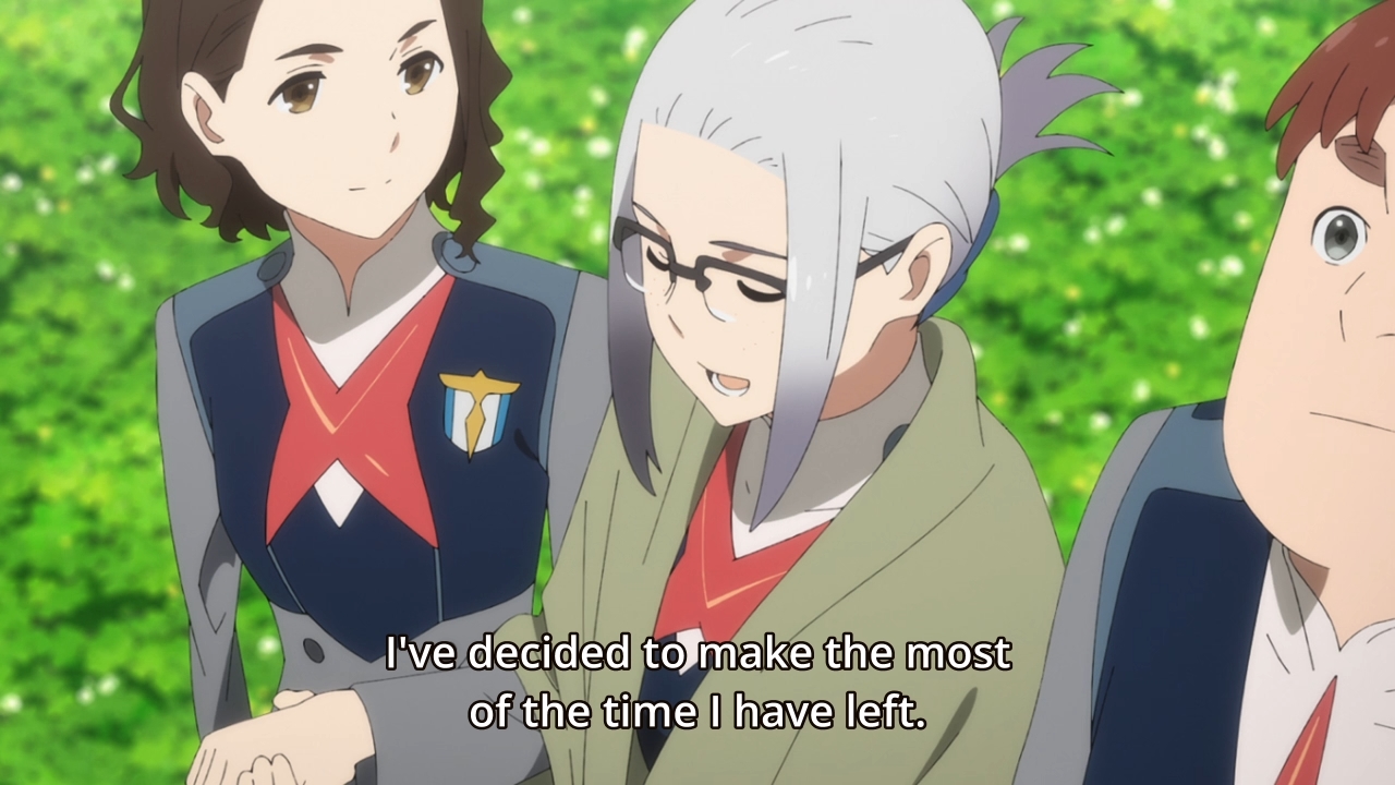 They really did it. They really went and gave us a 24-min denouement. Last week’s episode was the climax for sure. As for this week’s episode, it is practically nothing but one long and mostly unsatisfying wrap-up. Again, all I’m left with is a certain exasperated feeling that we got an incomplete story. DARLING in the FRANXX needed at least another season to fully explore its characters, setting, and themes. Unfortunately, all we get is the power of love and friendship overcoming spiritual space baddies, and everyone growing up to have lots and lots of kids. You hear that, Japanese audience? You need to screw like rabbits to save the country planet. Unfortunately for Ikuno, she’s a lesbian so all she gets to do is die young. No, seriously. She devotes the rest of her life to research, and she gets nothing but the satisfaction that everyone gets to live on without her. Parasites suffer from accelerated aging, so she wants to save her friends from such a horrible fate. In the end, they all get to have happy families. Unfortunately, the poor girl can’t save herself. By the end of the episode, she is practically confined to her hospital bed. Seriously, what is up with that? The writers have no shame in cramming a cheesy ending for each of the other characters down our throats, but Ikuno has to suffer in pain? Everyone else gets to live happily ever after, but she has to pop pills? I just… I don’t even know what to say to that.