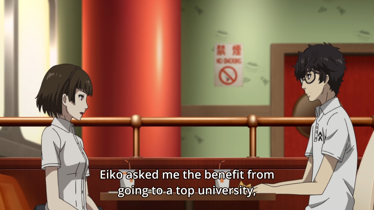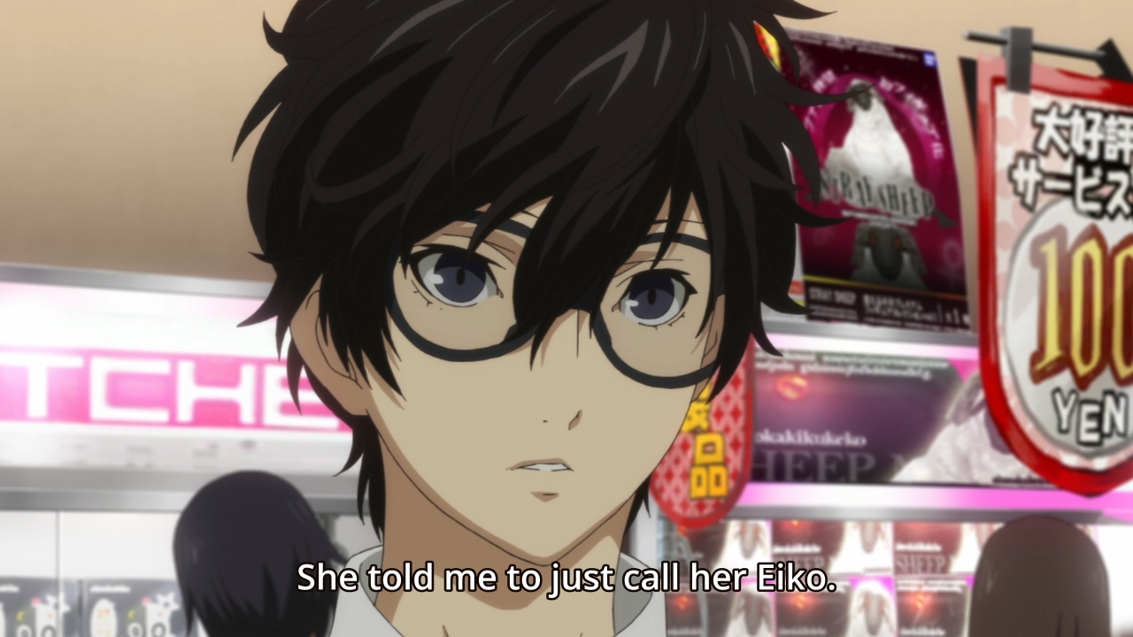 — Getting to know Makoto better also means getting to know Eiko better. Unfortunately, I don’t think the game gives the anime much material to work with. Eiko’s character is paper-thin in both iterations of the story. In any other series, Makoto’s mini-arc would probably take at least two or three episodes to complete (I’m thinking of how much time a character in a show like Clannad would get, for example). I guess we just don’t have the luxury of time on our side. It would’ve been cool to see a 50-episode version of Persona 5, but that would never happen. Persona 4 is more popular than it, right?
