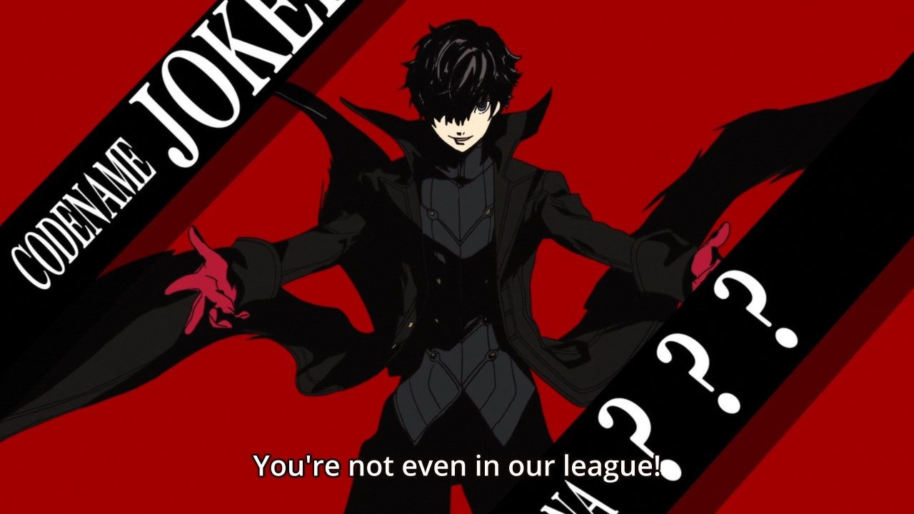 — These cards are odd, too. They don’t blend in with the rest of the animation, and why are they so flat looking? Why is he just standing in front of a blank, red background. This does not match Persona 5‘s aesthetics at all.
