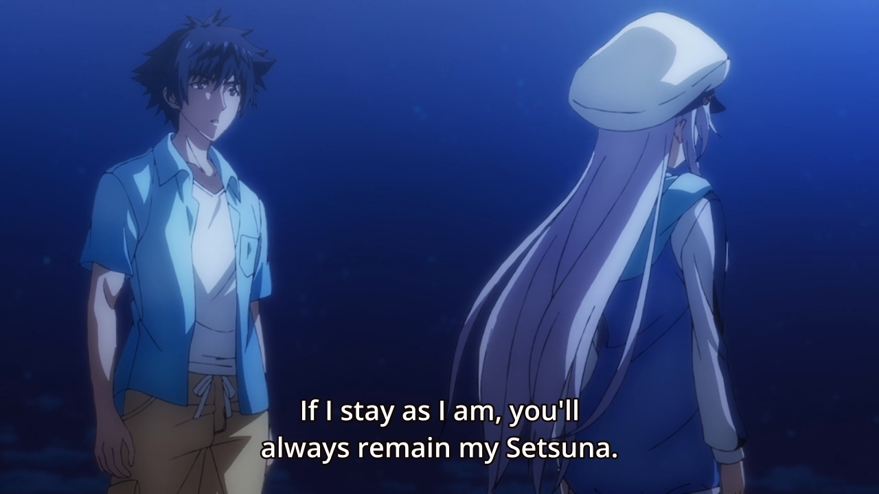 Now that the story has gotten settled in, it’s proven itself to be quite dull. Once again, Rinne insists that she step outside into the sunlight. She has “soot blight syndrome,” so the sun will kill her. It’s just funny, because the OP starts playing immediately after this scene, and what should we see in it? Rinne frolicking in the sun. Alright then. Anyways, Setsuna will come to learn, however, that although the disease is apparently real, the girl doesn’t actually have it. This is according to her mother, anyways. Five years ago, the girl disappeared, and when she returned, her memories were gone. As a result, she’s been clinging ever since to the island’s most infamous legend. Ah yes, the legend. The legend of incest. Why am I not surprised?