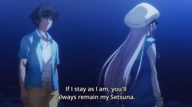 Somehow, Setsuna is supposed to unravel this mystery and save Rinne, Karen, and Sara from… from what? Honestly, I don’t even know. Rinne’s mother insists, however, that only Setsuna can take care of her daughter. After all, the girl is fixated on the legend, and she desperately wants Setsuna to be her fated prince. Still, I don’t understand why Kuon would put her trust into the main character at all. First, she barely knows him. And second, she wants him to save her from experience the curse for the rest of her life? She’s got all this money, so you’d think she’d fly in top notch psychiatrists to talk to the girl. Or maybe just leave the island herself and drag Rinne to some professionals. But nah, a strange dude showing up out of nowhere is truly the key to saving her daughter. Yep.