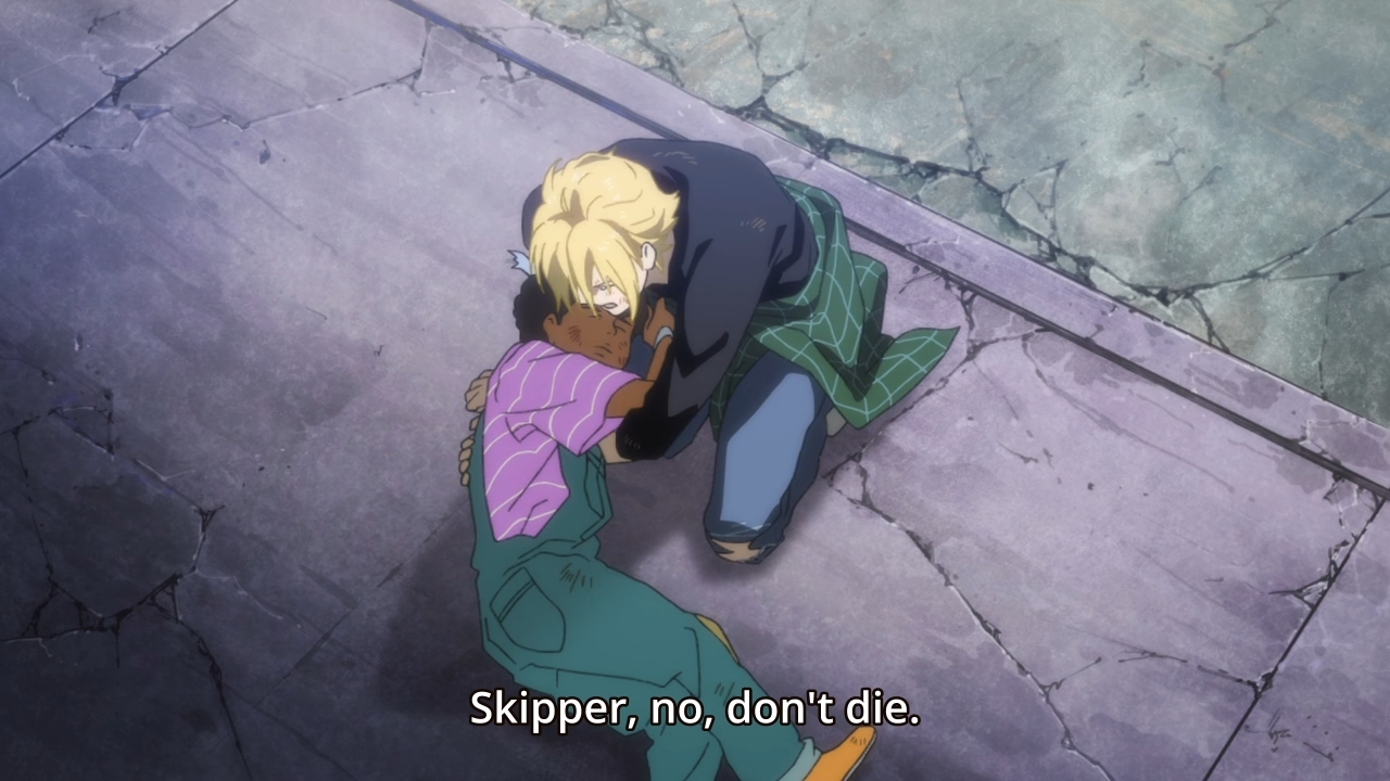 Midway through the episode, Marvin’s plans go awry. Not only has Shorter arrived at the wharf with Ash’s gang, the police are on their way as well. In the heat of the moment, Marvin turns around and fires two shots into Skipper’s chest. Obviously, no kid can survive that. More importantly, Skipper’s fate is just a prelude of things to come. A kid like him never belonged in this world. Maybe Skipper had nowhere else to go — I can’t really say, because he barely has any backstory after just two episodes — but hanging out with Ash and his gang wasn’t exactly the right place for for a kid like him to be either. Whether or not you hold Ash somewhat responsible for Skipper’s death, our hero will feel immensely guilty over the kid’s death. Truth be told, Ash is too soft to protect himself. If he could only close his heart to both Skipper and Eiji, Skipper’s death wouldn’t hurt him so much. If he hadn’t tried to rescue them, then he’d probably spare himself the immense amount of emotional anguish that he’s feeling right now. At the same time, however, if he loses his compassion for others, then he might become another heartless mob boss just like Golzine wanted. Damned if you do, damned if you don’t. This will also affect how his friendship with Eiji plays out over the course of this series. Eiji is older and thus tougher than Skipper — more durable to life’s harsh lessons — but all this means is that it’ll take longer for the world to break him. Either that or Ash breaks first in his attempt to shield Eiji from the darkness and depravity around them (if the OP is anything to go by).