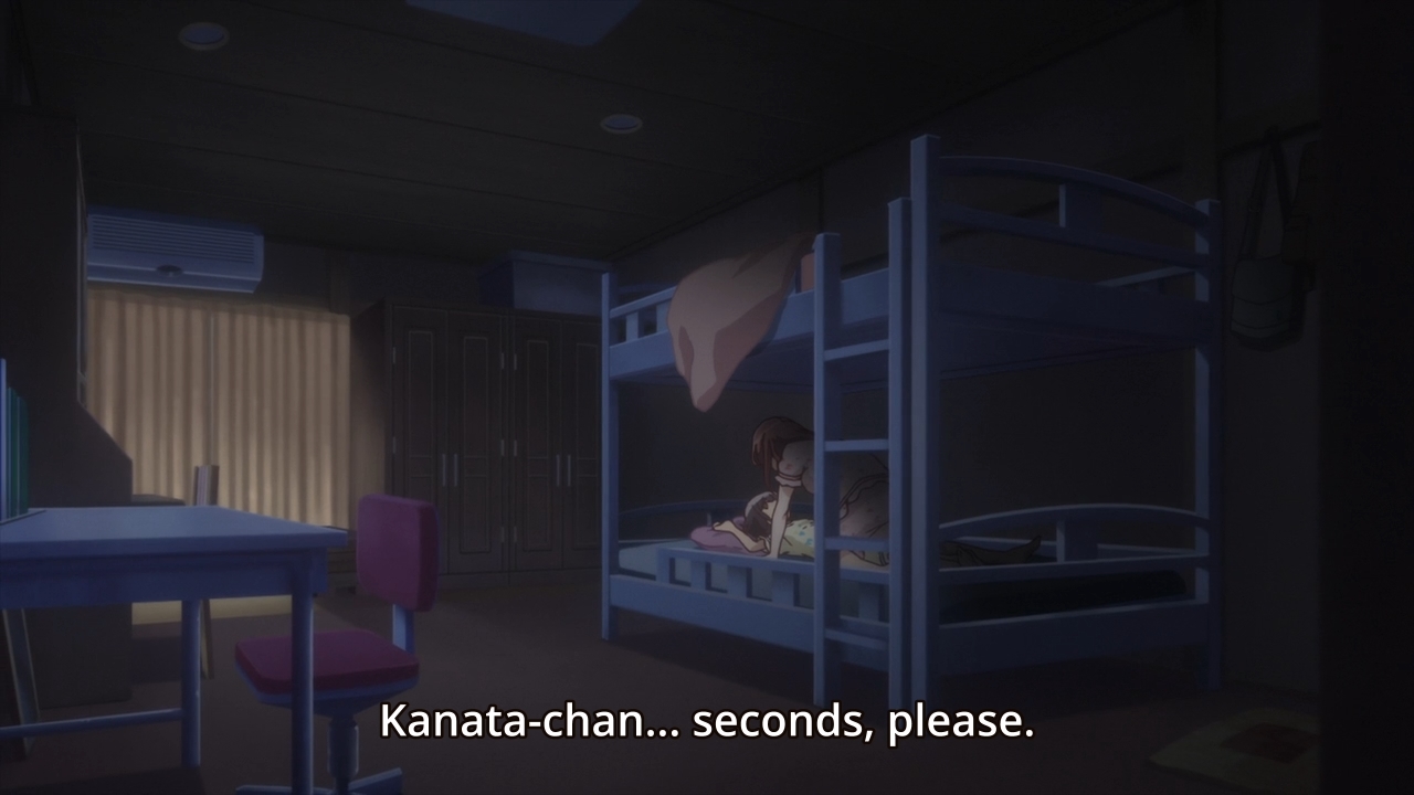 — After dinner, we get another flashback about Kanata’s failures. Same deal, though. The girl froze up. The girl is short. This isn’t a very multilayered story.
