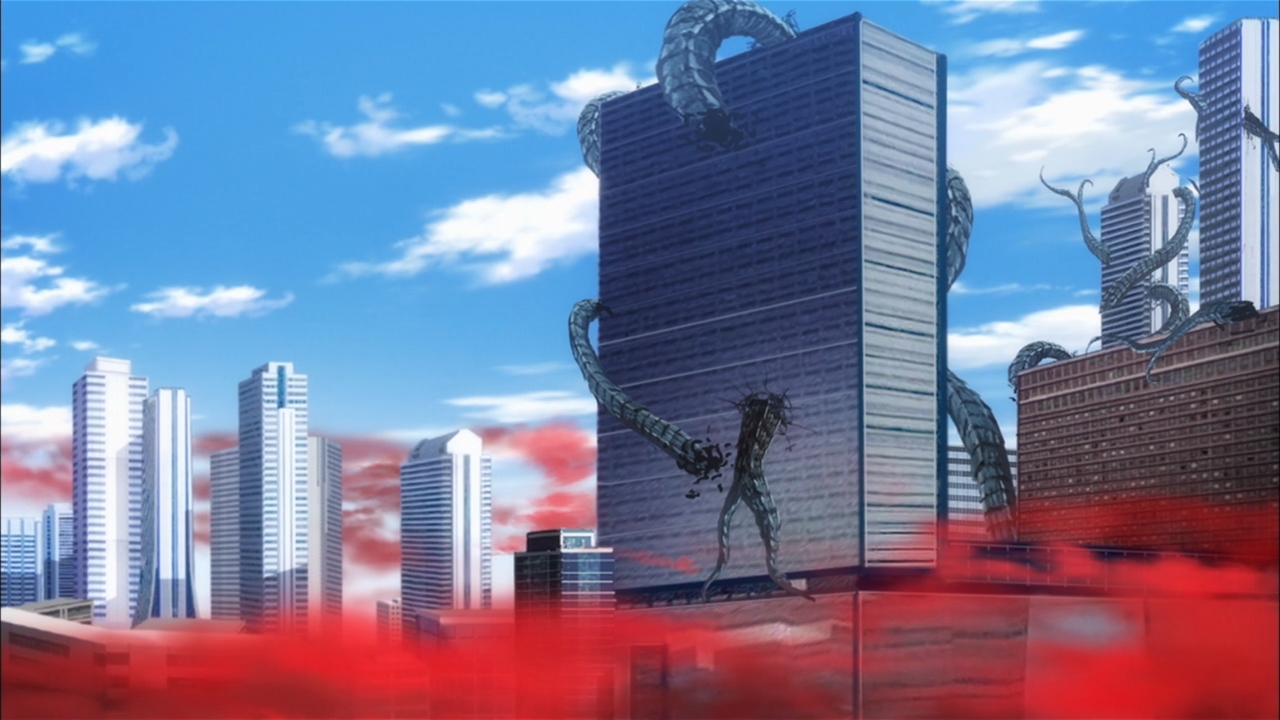 After the OP, the story finally decides to start from the very beginning, but things don’t stay peaceful for long. We are introduced to Chihiro, the hero of the story. He has a talent with kendo, but he also likes to read Shakespeare’s plays in his spare time. What a sophisticated young man. On this fateful day, however, that mysterious girl from the opening sequence appears to be stalking our hero. As soon as he gets to his college campus, an obnoxious ringing sound can be heard throughout the entire metropolis. Every living creature is affected — even cute, little birds and obnoxious schoolchildren. Before you know it, the entire population of Tokyo has fallen unconscious. After a cryptic dream sequence full of quotes from Shakespeare, Chihiro awakens to find the city enveloped in a red mist. A strange tree has also taken root in some of the skyscrapers. Last but not least, our hero’s been asleep for five months. Most people apparently woke up in a week (if the whole city was asleep for at least a week, these individuals survived without water?!), but not him. The fact that he can walk and fight after being in a coma for five whole months is proof enough that he’s special. I wonder why, though. What makes him so great? Then when he tries to leave the hospital, he is confronted by a nosy reporter who mentions something about an incident from 13 years ago. So many questions to answer!