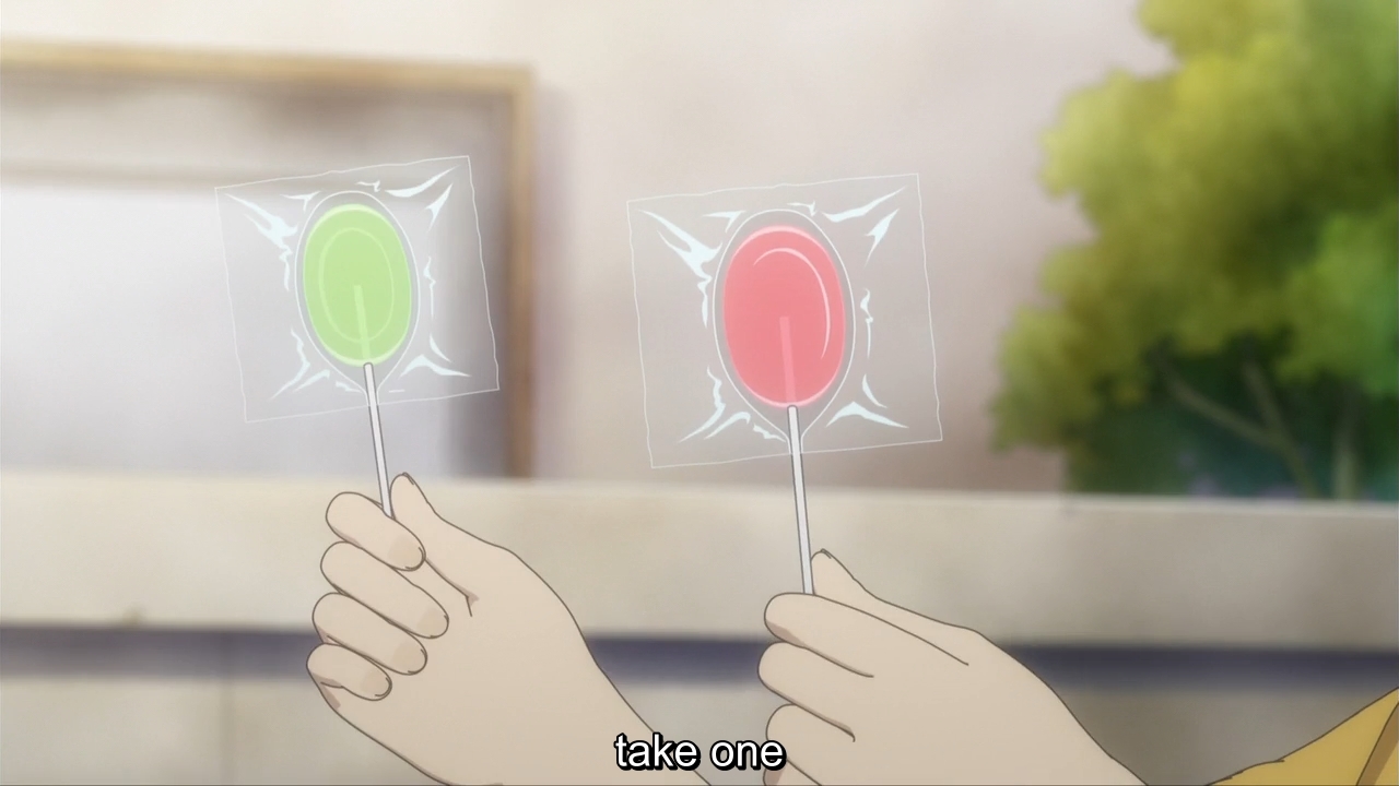 — After they both finish the game, Haruo apologizes to Akira by getting her a lollipop. He also got one for himself, so she takes both of them. Eh.