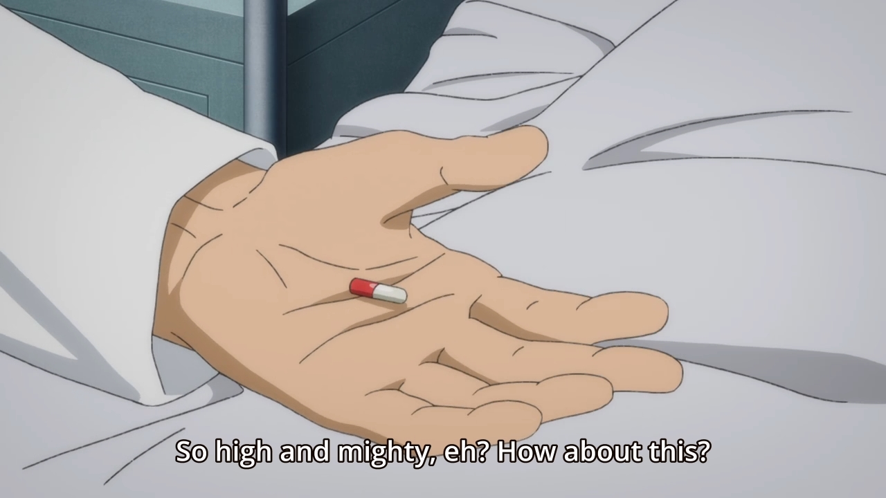 — So… did Ash allow himself to be cornered by the rapists just so he could end up in the infirmary? He makes a point of requesting a pill capsule, which he of course doesn’t take. It’s hard to imagine, but it’s possible that he took all that heinous punishment just to find a way to sneak a message into a tiny pill capsule.
