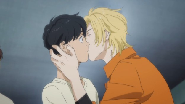 — On the other side of the room, Eiji has come to visit Ash. Just as visitation is about to end, Ash suddenly plants a big, juicy kiss on Eiji’s lips — his first kiss, in fact. There’s likely attraction here, but Ash’s main goal is to slip a secret message to Eiji. Okay, sure, but how long did he have that pill capsule in his mouth? Don’t those things dissolve relatively quickly?