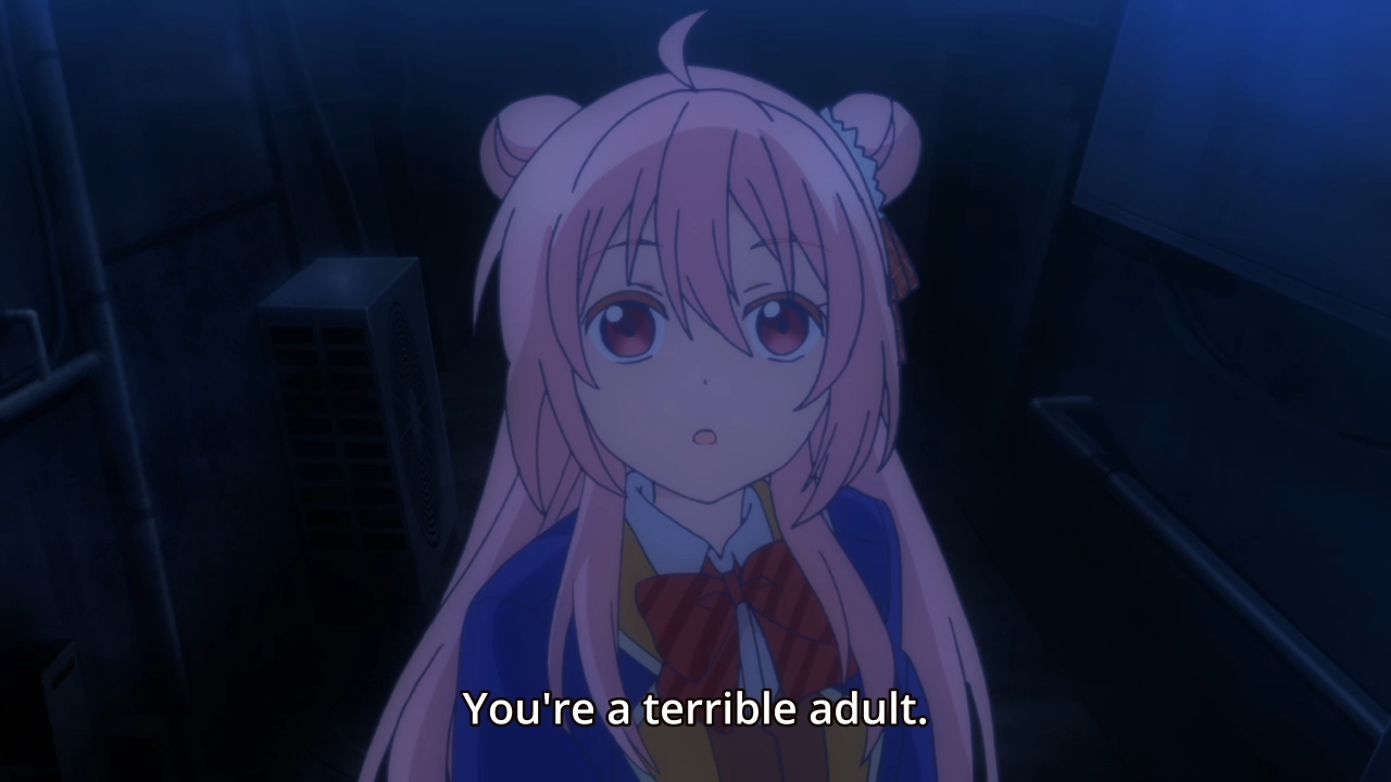 Same shtick as last week: Satou is deranged, but it could be worse. She could be an adult, then she’d truly be a fucked-up individual. In this week’s episode, she finds herself being stalked by her rapey teacher. So y’see, the reason why her concept of love is so unhealthy is because everyone around her is so sinful! Nurture over nature, man! Satou never had a chance to be normal! Anyways, like with her manager, the girl gets the upper hand on the perv and threatens to expose him unless he does whatever she wants. As a result, Satou manages to find someone to help her dispose of some evidence. The basic theme of the show right now is that adults suck. Adults suck, and as a result, their children are messed up. So even if the children err, you can’t help but feel bad for them. They never stood a chance! Hah, well, fuck that.