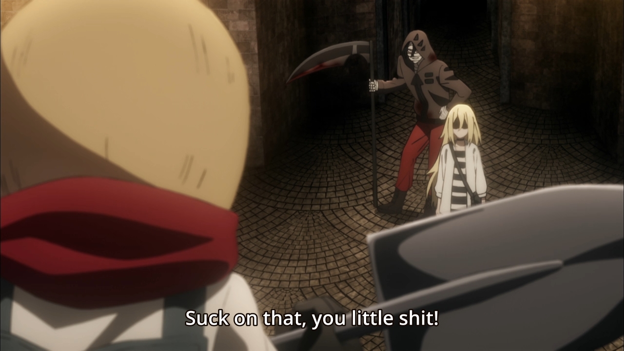 Rachel wants to be killed, and people want to kill her. Win-win, right? Sadly, no. Unfortunately, our heroine can only be killed once. That’s the tricky part about murder; you can’t keep murdering the same person over and over again. And since multiple people want to kill Rachel, what can she do but choose just one lucky winner to end her miserable existence? In this week’s episode, Eddie tries as hard as he can to convince Rachel to give him the honor of taking her life. Unfortunately, she feels that if she doesn’t let Zack kill her, then he’ll never escape this building. Y’see, this is important, because…? Also, something about God. Yeah, God is really important in this week’s episode (and probably future episodes to come). But don’t ask me, because I don’t really know jack shit. As you can probably tell, I’m not too fond of this anime. Maybe if you don’t take its story at face value, you might appreciate Angels of Death. But after three episodes, I still find it both equally dumb and boring as hell. Minutes after minutes of “I’ll totally kill you better! Trust me!” Gimme a break.