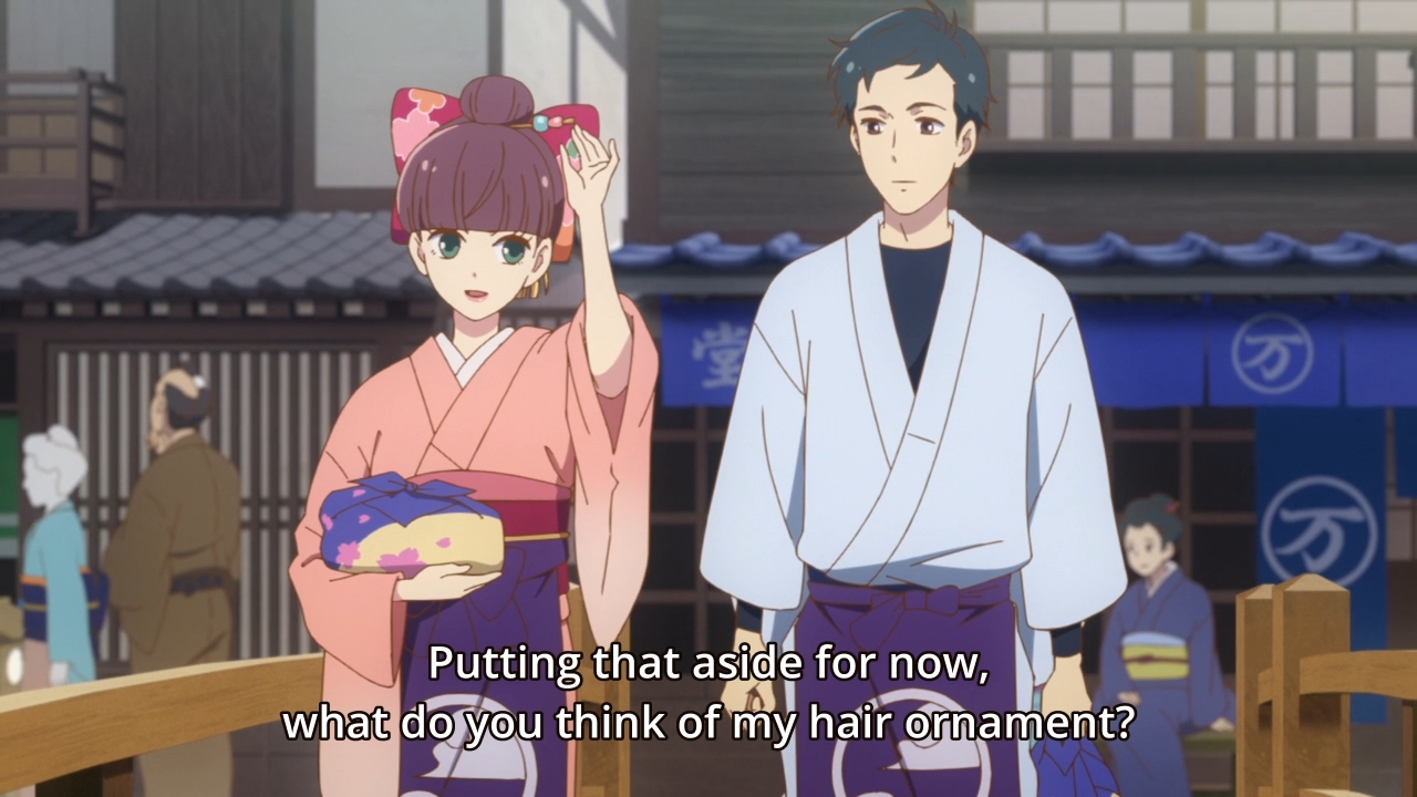 Anyways, the first episode is about an arranged marriage that might fall through if a certain frog tsukumogami isn’t recovered within a reasonable time frame. It’s apparently an important family heirloom. And in the process, we learn all about how humans tend to discard their precious possessions once they are no longer useful to us. Well, duh. What else am I supposed to do? I’m sorry, but unless I have empirical evidence that I’m hurting my stuff’s feelings, I’ll dispose of them away as needed. But I digress. Like I said, the show’s not terribly exciting. I also found the choice of music to be very strange, especially the OP.