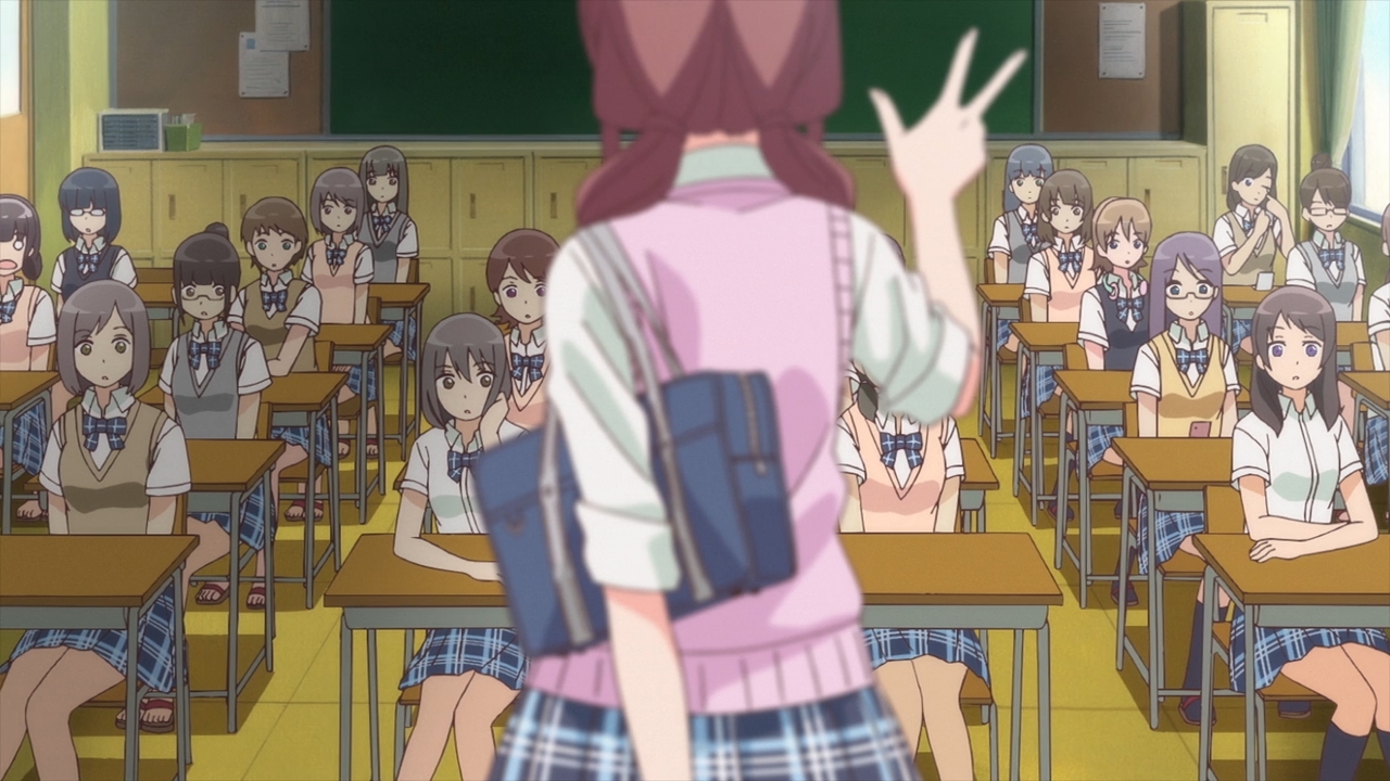 — Haruka finally gets the chance to introduce herself to her new classmates, but for some reason, they just stare at her with wide eyes. Maybe her Tokyo genki-ness is too outta control for their Okinawan sensibilities. Shrug.