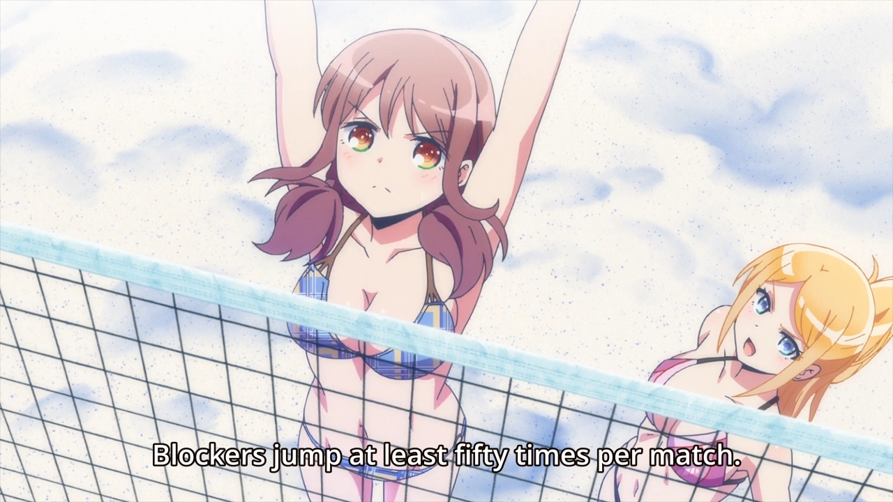 — In any case, Haruka now has to practice her blocks. This means she gets to jump up and down repeatedly in her swimsuit, and we can’t call it fanservice. I mean, it still is, but y’know…