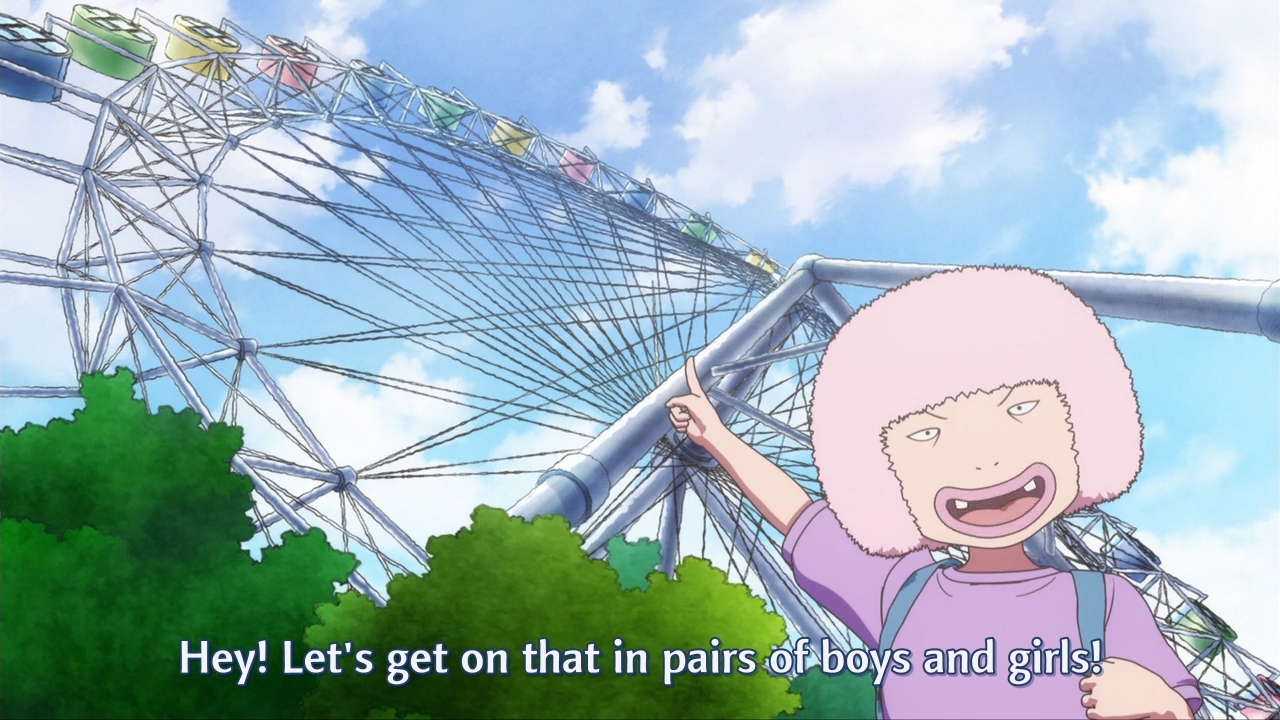— Even though he wanted to stick with the flower garden, Doi quickly embraces the theme park option. He starts fantasizing about how he’ll impress Akira through the various attractions. He’ll then seal the deal on the ferris wheel, because that’s apparently where all the romance goes down. Doi even thinks he’ll reach third base. Yo, have you even gotten to first base before?