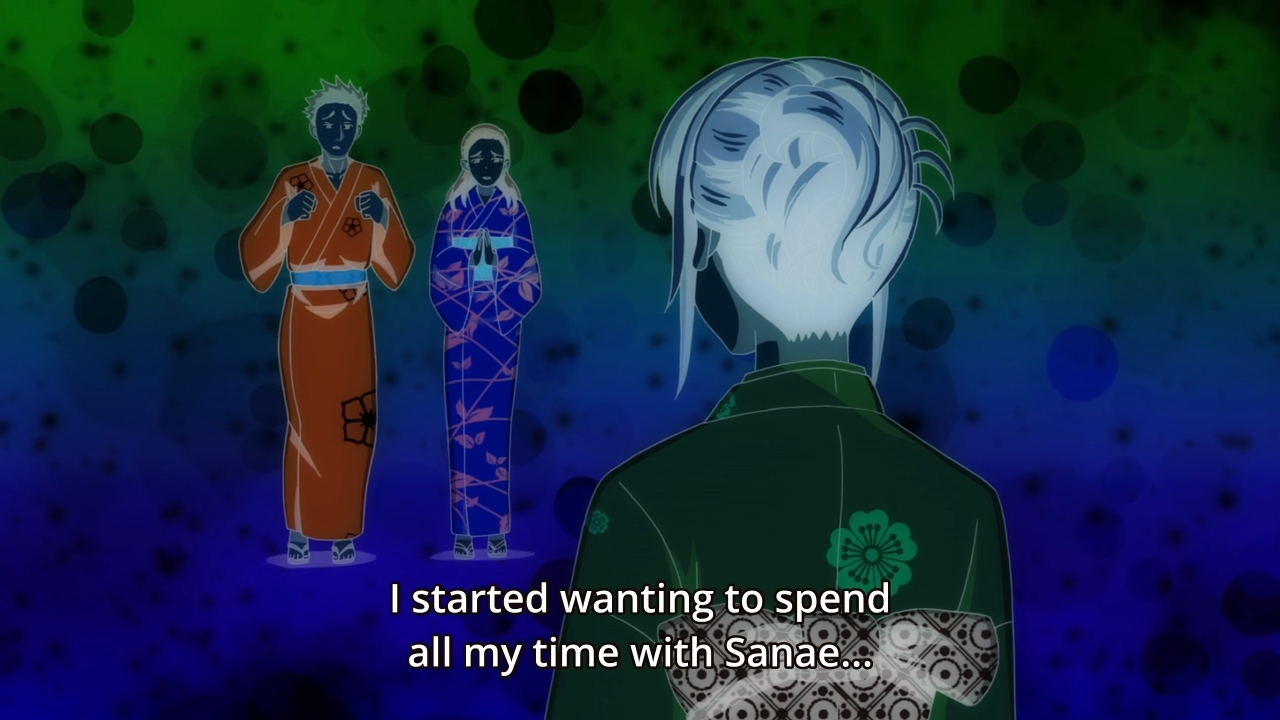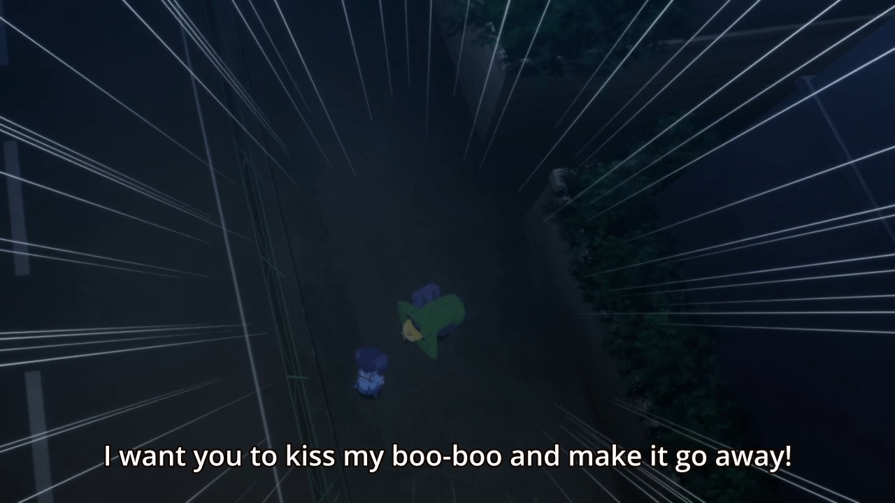 Anyways, Satou resists the temptation to murder Asahi, but she’s definitely pissed that someone else knows the words to Shio’s vows. I wanna say they’re probably siblings, but I doubt that small, little detail would make a difference to Satou. You can’t reason with the mentally ill. When she returns to the apartment, she discovers that Shio has gone missing. Meanwhile, Shio bumps Taiyou, and… well, he obviously needs help.