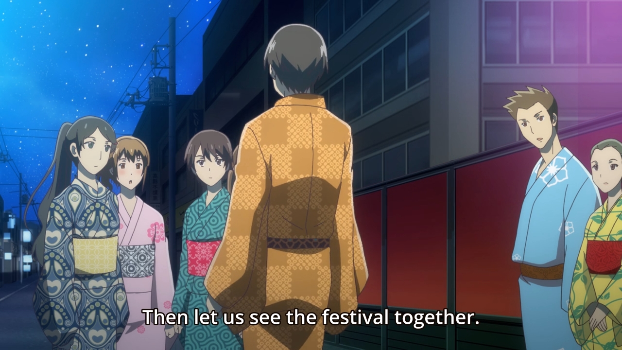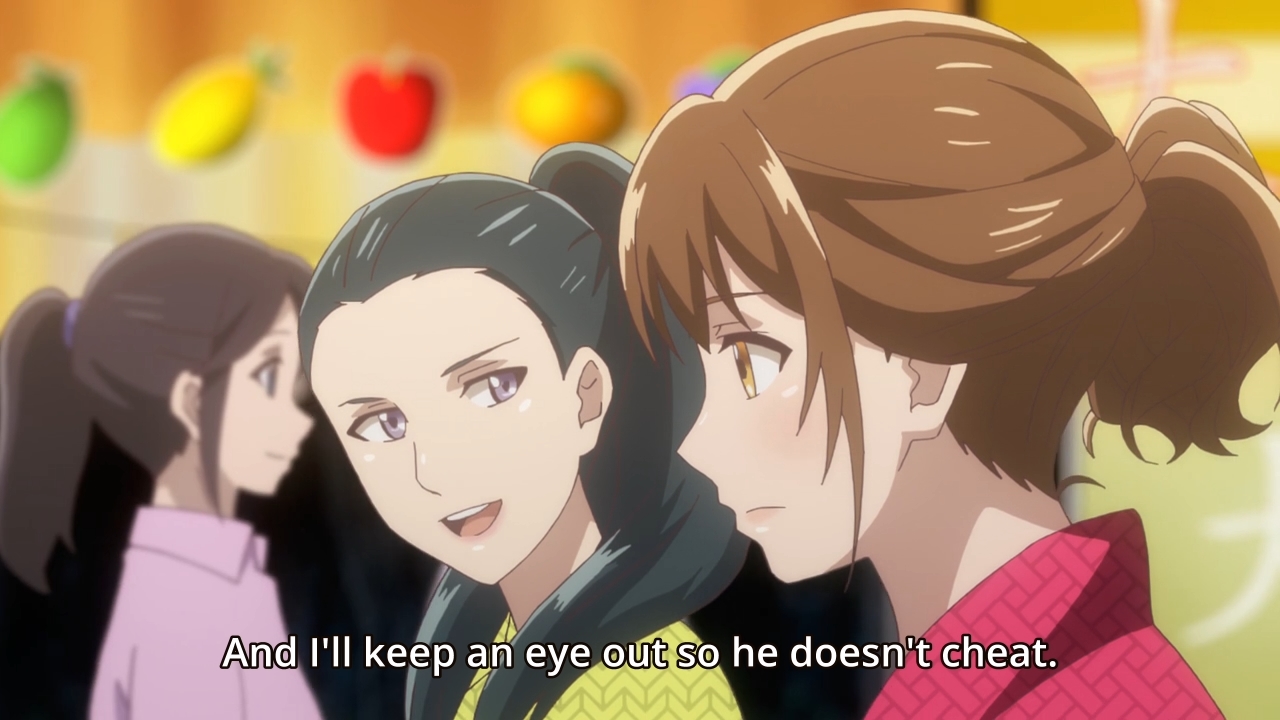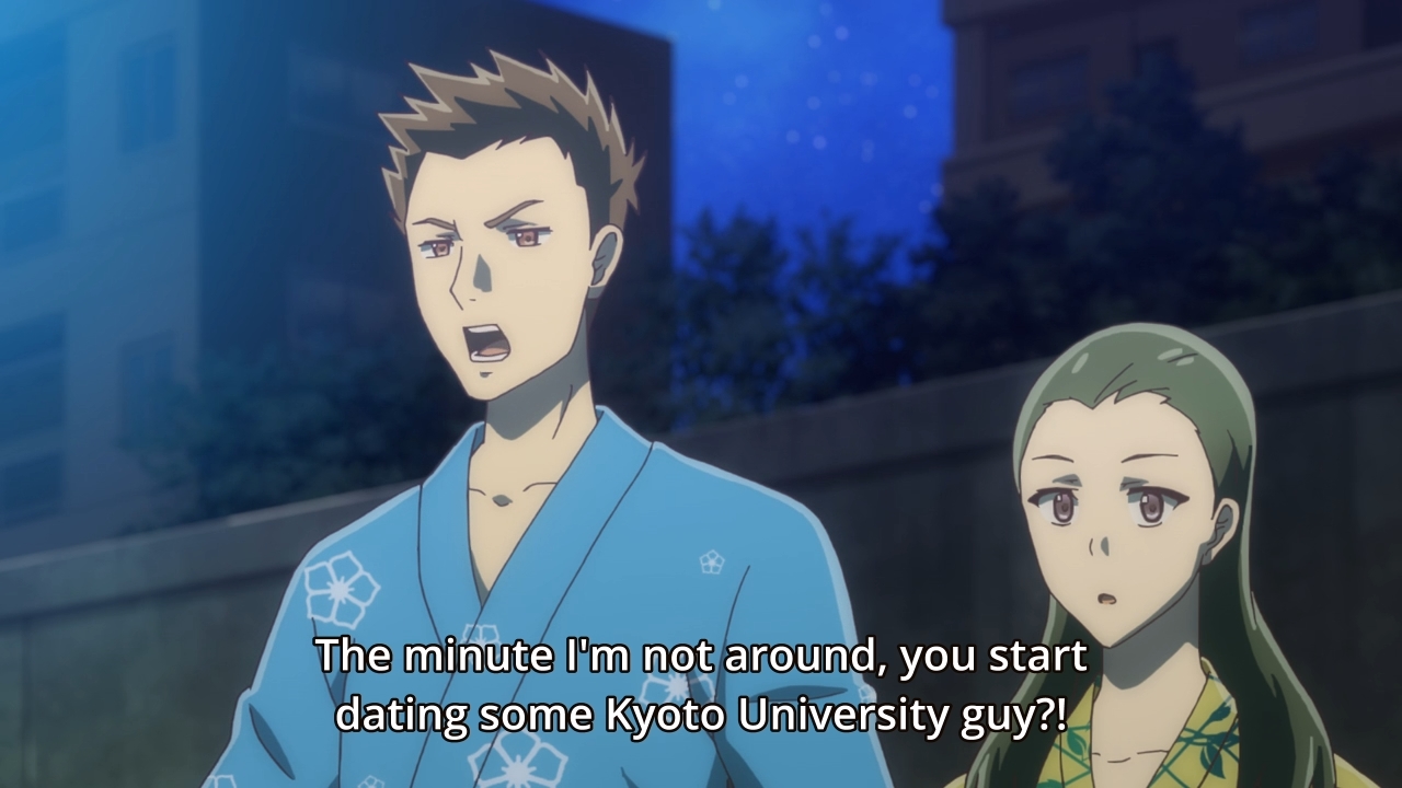 As for our heroine, a few of her old classmates have decided to drop by Kyoto for an upcoming festival. Unfortunately, her cheating ex and her terrible ex-best friend are also tagging along. As soon as Aoi tries to meet up with those that she still consider to be her friends, she is immediately ambushed by the new couple. They want her blessing. They want her forgiveness. They never meant for it to happen. They were lonely and couldn’t help but find comfort in each other’s arms. Boo hoo. Anyways, it is kinda weak of her other friends to spring those two on Aoi like that, don’t you think? She’s right; they’re not here because they truly care about her. In general, people don’t really seem to understand how being cheated on can mess someone up, though. Aside from the initial heartbreak, it can fundamentally change you as a person. You become less optimistic, more anxious, less trusting, more closed-off, so on and so forth. Being cheated on will likely even affect all of your future relationships. Anyways, Aoi wants to tell them all off, but she’s got no sass. She’s not a tough girl who grew up on the wrong side of the train tracks. As a result, she just pretends as though she’s now okay with everything even though she’s mentally screaming on the inside.