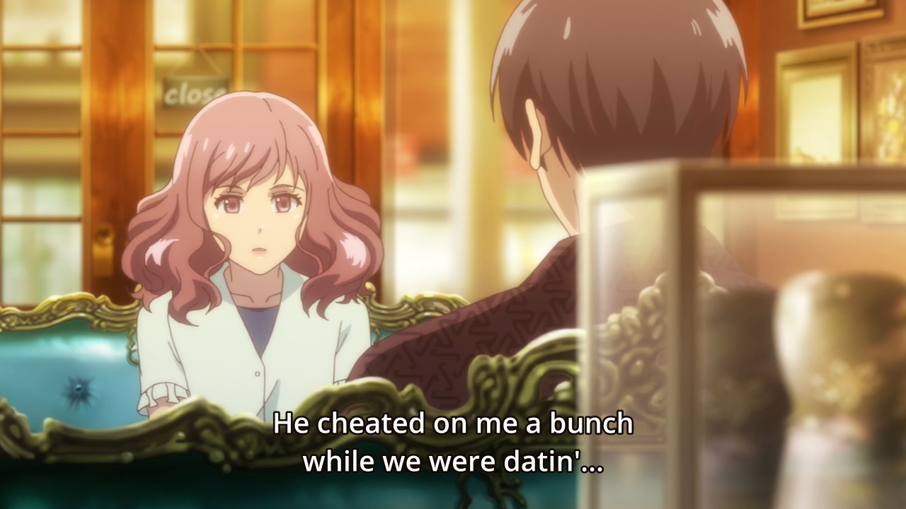 This show is obsessed with cheaters. It feels like we can’t go a single week without mentioning Aoi’s ex (ironically, her ex-best friend was supposed to keep an eye on him) or how Holmes had his girl stolen from him. I almost want to ask the writer who hurt them. Who made them this way? Anyways, Holmes’ ex is back, and it sounds like she wants to now cheat on her husband with her high school sweetheart. Izumi even claims that the guy cheated on her, but she still married him. People are funny like that. So what does she want now? A brief fling with Holmes to get back at her adulterous husband? Or to honestly rekindle old flames? If Izumi truly wanted the latter, she would’ve broken up with her husband by now. Granted, I don’t really know how divorce works in Japan. In any case, this is anime, so people can’t communicate properly. So instead of talking, they try instead to convey their feelings through art and poetry. A certain teacup supposedly tells Holmes that her love for him is still undying — something like that. In the end, however, he rejects her much to Aoi’s relief. Obviously, she’s attracted to him. It doesn’t take Sherlock Holmes to figure that out.