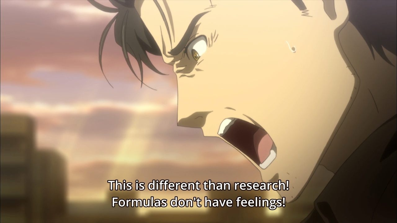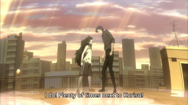 Things finally come to a head when Rintaro discovers that the Phone Microwave is back. He and Maho proceed to get into a shouting match. She wants the ideal future — a future with both Kurisu and Mayuri, but also no WW3. On the other hand, he’s only human. His soul can’t keep taking the hits… or can it? The music during this scene is great. The sun tearing through the clouds to shed light on our heroes is also great. This is an argument that needed to happen. Unfortunately, it also needed to happen back in the first episode. I think we took too long to get to this point, so my interest has waned significantly.