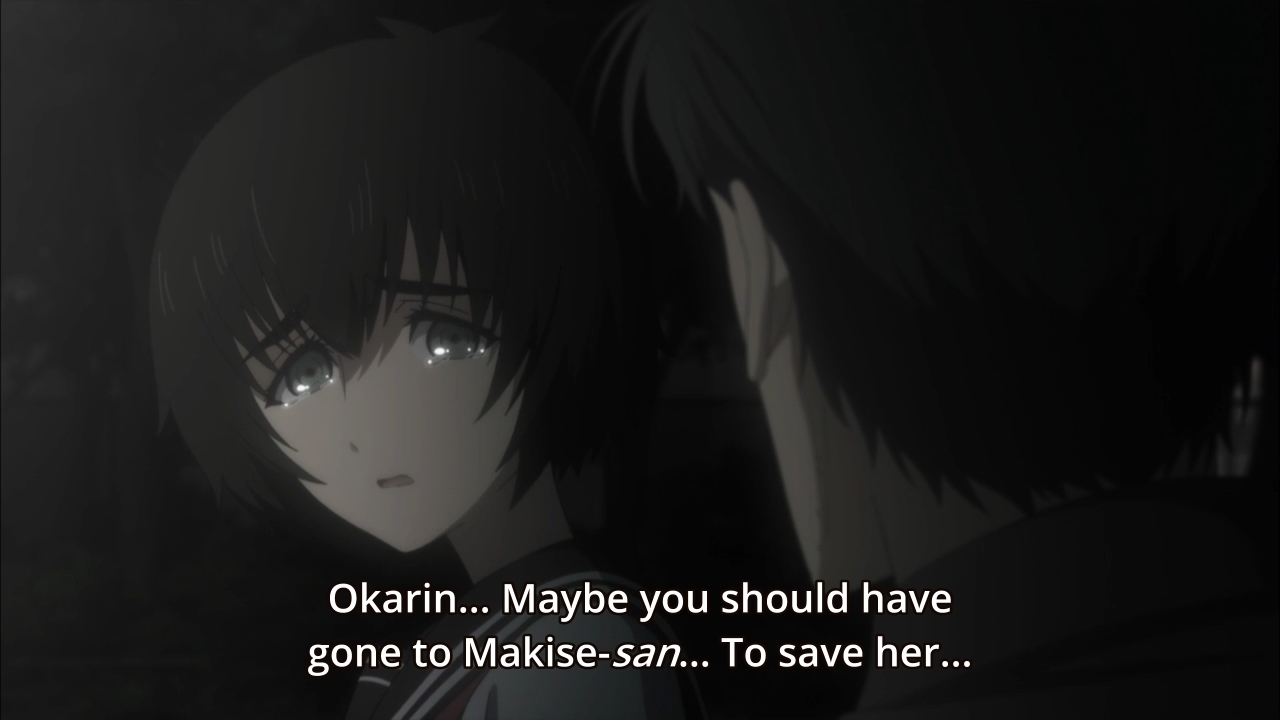 It doesn’t help either that Mayuri starts feeling guilty. I don’t blame her for that, but again, her difficult conversation with Rintaro at the end of the episode should have happened a whole lot sooner. Someone should have told him that he’s been in denial ever since he called it quits on saving Kurisu. The fact that it took them this long to mentally slap him across the face… ah, it’s just outrageous. I really do think Steins;Gate 0 has pacing issues.