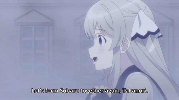 — Finally, we cut to Takanori and Asahi. The girl is a child, so she just keeps saying the same thing over and over. Let’s reunite Subaru! Let’s be friends again! I don’t want to understand that things have changed while I was dead! Time didn’t pass for me, so wah wah wah! But hey, she’s a child so whatever.