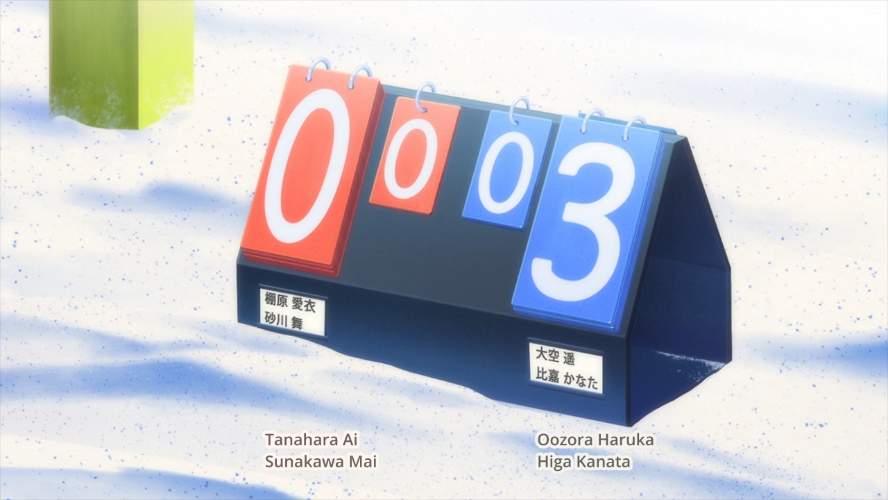 — Anyways, the second set begins, and we’re suddenly moving very quickly. Before you know it, it’s already 10-7 in Ai and Mai’s favor. Haruka starts worrying even though they’re only down three points. Three points is kinda nothing. If you tell me that the other team is suddenly playing much better, I expect the difference to be a little more than three points.