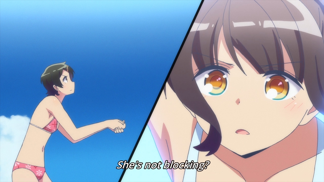— During the break between sets, Kanata laments that her pokeys aren’t working anymore. Yeah, that’s ’cause you keep using it. I don’t remember Emily telling the girl to go to it every single time. You’d think someone who loves volleyball as much as she does would switch it up. Okay, she’s too small to be a power player, but that doesn’t mean every hit has to be a pokey.