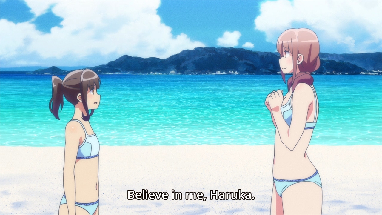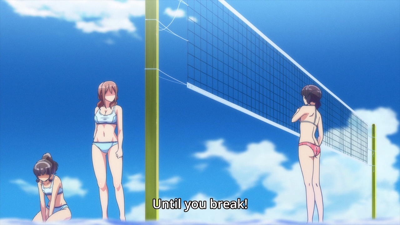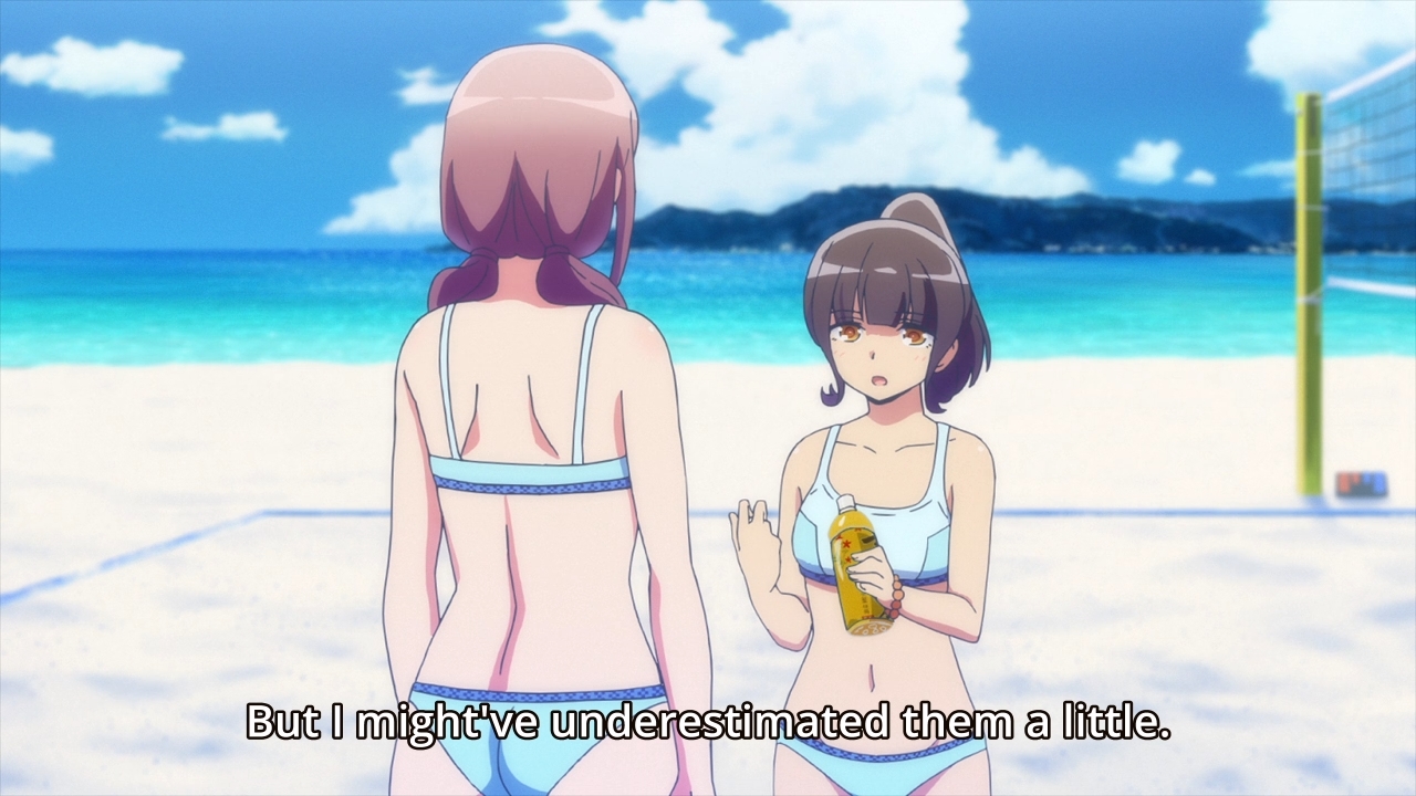 — Our girls learn that their first round opponents are those same girls that they met last week. Y’know, the ones that managed to buy Haruka’s favorite swimsuit. Kanata and Ai are getting along, but for some reason, Mai has it out for Haruka and vice versa. Judging by Mai’s height and how she likes to call our heroine a giantess, she probably has a chip on her shoulder.