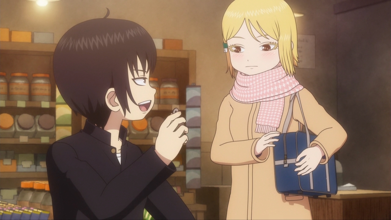 — When Koharu can finally go home, she runs into that classic anime situation: she forgot to bring an umbrella. Instead of sharing one with Haruo like you might expect, however, he ends up inviting her into one of his safe havens: that dagashi shop that we had seen in the first three episodes.