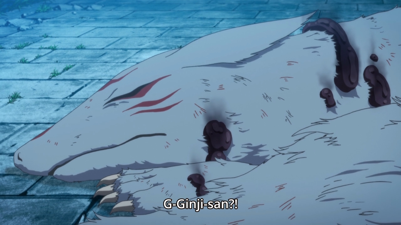 — Apparently, our fox boy is having a lot of trouble retrieving that mermaid scale. As a result, his body is covered in impurities. I’m kinda reminded of that scene in Spirited Away. Y’know the one… stuck in his dragon form, Haku was horribly injured. Sen fed him a dumpling that eventually made him cough up the black slug that was poisoning him from the inside.