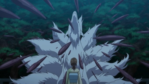 — Ginji tells Aoi to stay away, but she does what she wants. This is her show, buddy. She tells him to open his mouth, and when he does so, she puts this tiny morsel of food on his tongue. It’s all relative, of course, To us, it’s a big piece of sushi — gigantic, actually. But to a fox god, I can’t believe something that small would instantly heal Ginji right back up.