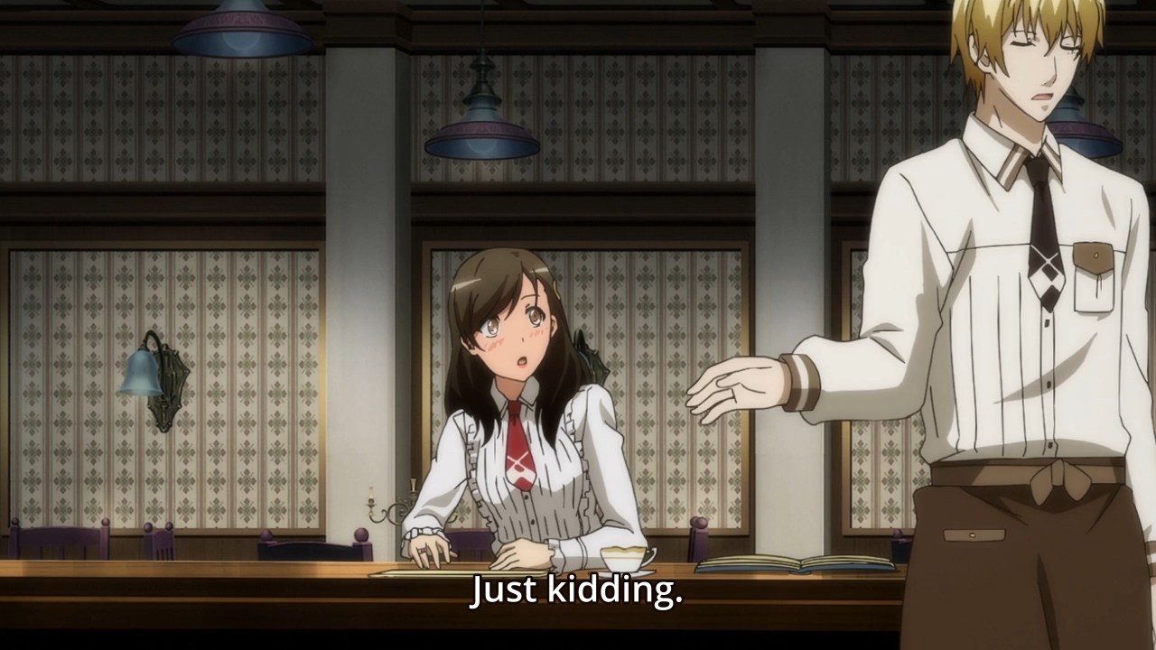 — Back at the cafe, Ton has changed into her new manager’s outfit. Everyone showers her with compliments. Everyone but Vlad, that is. He’s too tsuntsun for that, so he would rather tease the girl. I think there’s something odd about the way he looks here, but this is probably just due to the show’s shoddy animation.