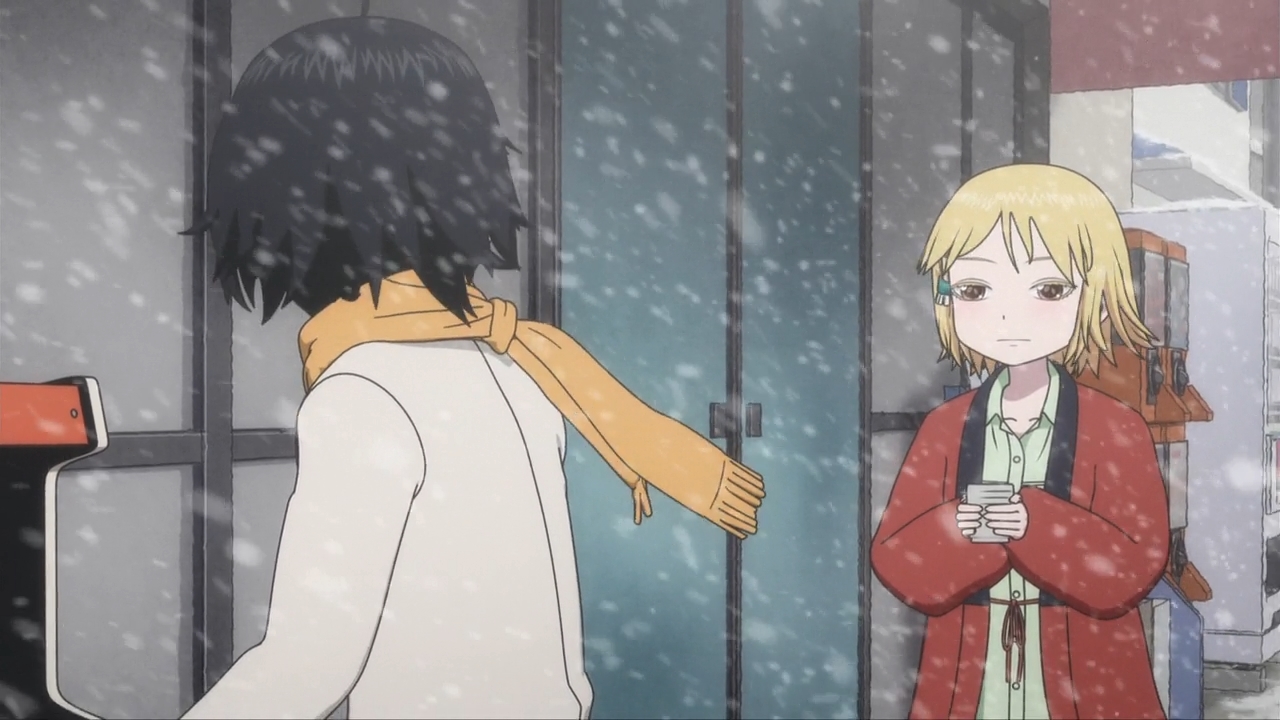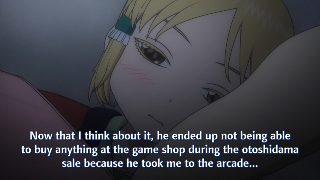 — The next day, she’s told that “her boyfriend” is outside the family store, playing games in the cold. She debates whether or not she should go down to see him. On the one hand, Haruo is probably only here for the games. On other hand, maybe he’s here to see her! Maybe! Of course, we know that’s silly, but like I said, given enough time, the mind will play all sorts of tricks on itself.